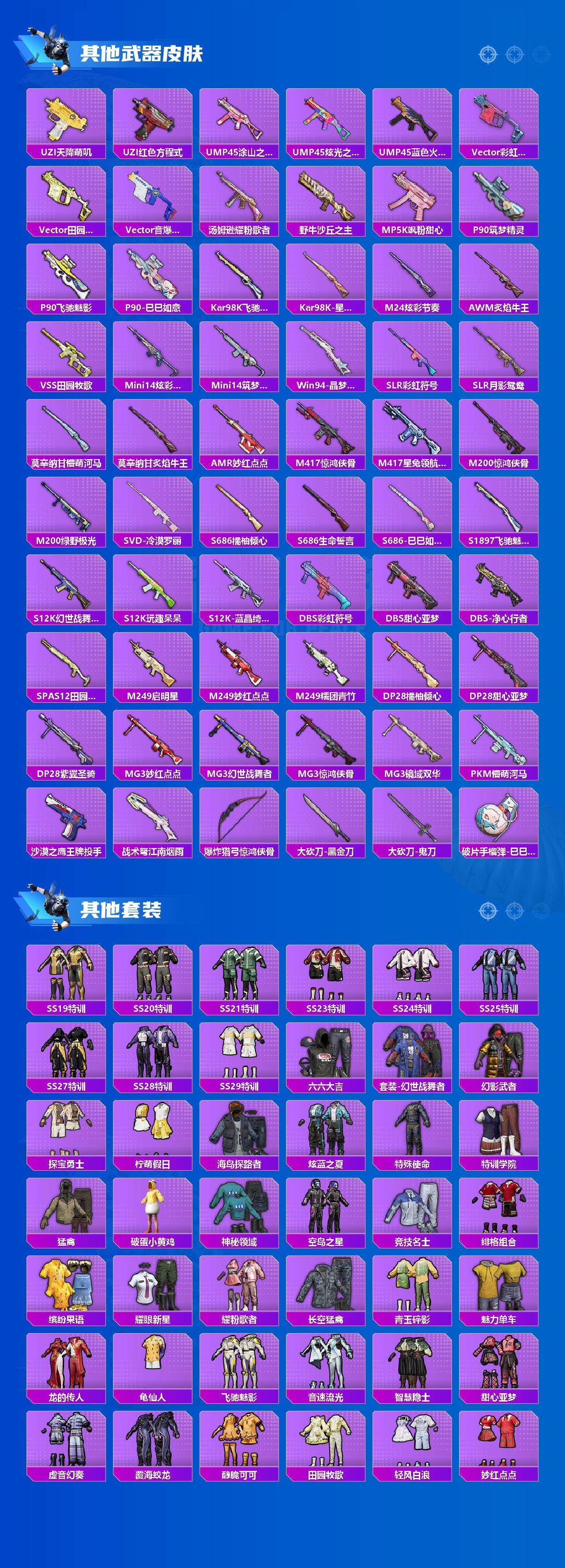 【稀有枪皮】:AKM-2P战斗服款,AKM-彩虹符号,AKM-破晓战魂,AKM-筑梦精灵,AKM-缤纷海域,AKM-龙的传人,M16A4-甜心亚梦,SCAR-L-炫彩节奏,SCAR-L-玉兔迎春,SCAR-L-红色方程式,M416-紫翼圣骑,M416-红色方程式,GROZA-2B战斗服款,GROZA-懵萌河马,GROZA-田园牧歌,GROZA-紫翼圣骑,GROZA-晶梦幻蝶,AUG-天降萌叽,AUG-耀粉歌者,QBZ-彩虹符号,QBZ-飞驰魅影,M762-天降萌叽,Mk47-妙红点点,G36C-镜域双华,G36C-懵萌河马,G36C-炙焰牛王,G36C-青丘仙客,AC-VAL-甜心亚梦,蜜獾-天降萌叽,Famas-镜域双华,UZI-天降萌叽,UZI-红色方程式,UMP45-涂山之恋,UMP45-炫光之旅,UMP45-蓝色火焰,Vector-彩虹符号,Vector-田园牧歌,Vector-音爆索尼克,汤姆逊-耀粉歌者,野牛-沙丘之主,MP5K-飒粉甜心,P90-筑梦精灵,P90-飞驰魅影,P90-巳巳如意,Kar98K-飞驰魅影,Kar98K-星穹咏叹调,M24-炫彩节奏,AWM-炙焰牛王,VSS-田园牧歌,Mini14-炫彩节奏,Mini14-筑梦精灵,Win94-晶梦幻蝶,SLR-彩虹符号,SLR-月影鸳鸯,莫辛纳甘