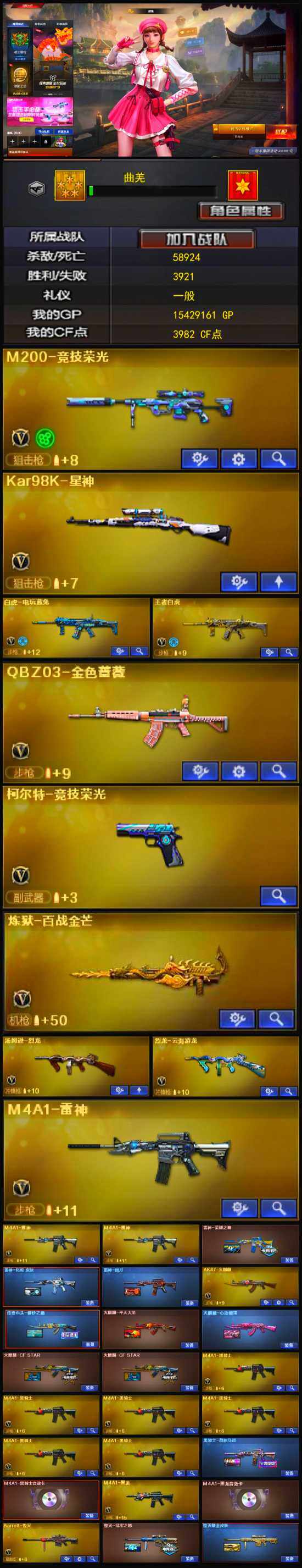 【热门武器】:QBZ03-金色蔷薇,M200-竞技荣光,白虎-电玩蓝兔,Kar98K-星神,M4A1-黑骑士*6,汤姆逊-烈龙,沙鹰-修罗*5
