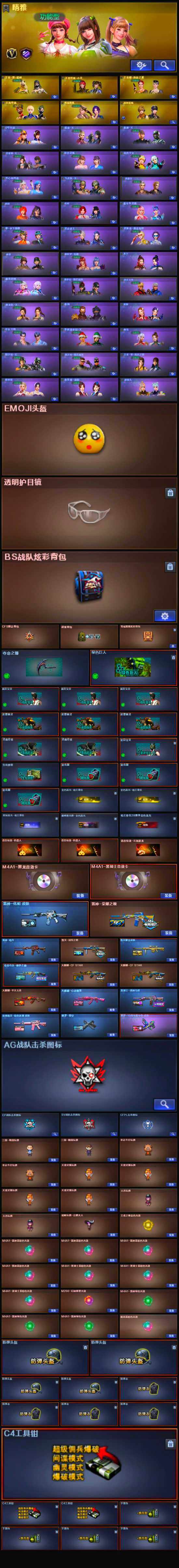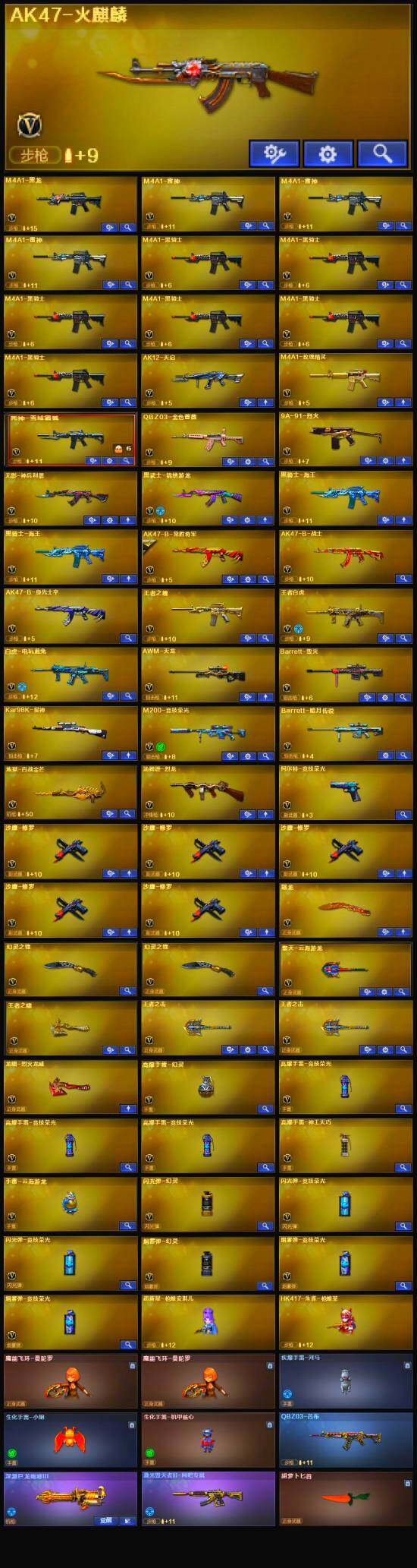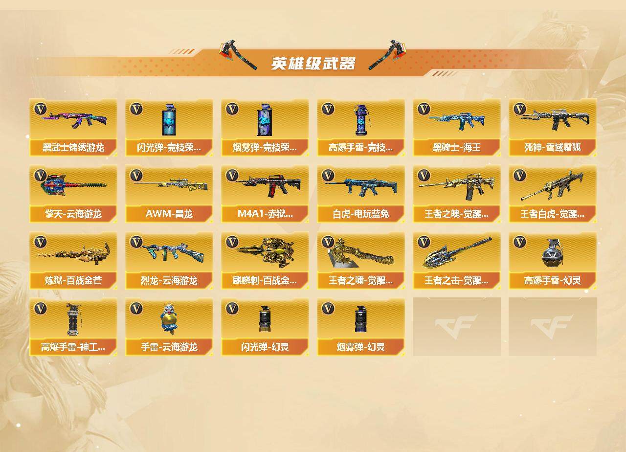 【英雄级武器】:AK47-火麒麟,M4A1-黑龙,M4A1-雷神*3,M4A1-黑骑士*6,AK12-天启,无影-神兵利器,黑武士-锦绣游龙,死神-雪域霜狐,M4A1-玫瑰精灵,QBZ03-金色蔷薇,王者之魄-觉醒版,黑骑士-海王*2,AK47-B-常胜将军,王者白虎-觉醒版,白虎-电玩蓝兔,AWM-天龙,Barrett-毁灭,Kar98K-星神,M200-竞技荣光,炼狱-百战金芒,汤姆逊-烈龙,烈龙-云海游龙,沙鹰-修罗*5,柯尔特-竞技荣光,屠龙,幻灵之锋*2,擎天-云海游龙,麒麟刺-百战金芒,王者之啸-觉醒版,王者之击-觉醒版*2,高爆手雷-幻灵,高爆手雷-竞技荣光*3,高爆手雷-神工天巧,手雷-云海游龙,闪光弹-幻灵,闪光弹-竞技荣光*2,烟雾弹-幻灵,烟雾弹-竞技荣光*2,M4A1-赤狱骑士,AWM-昌龙