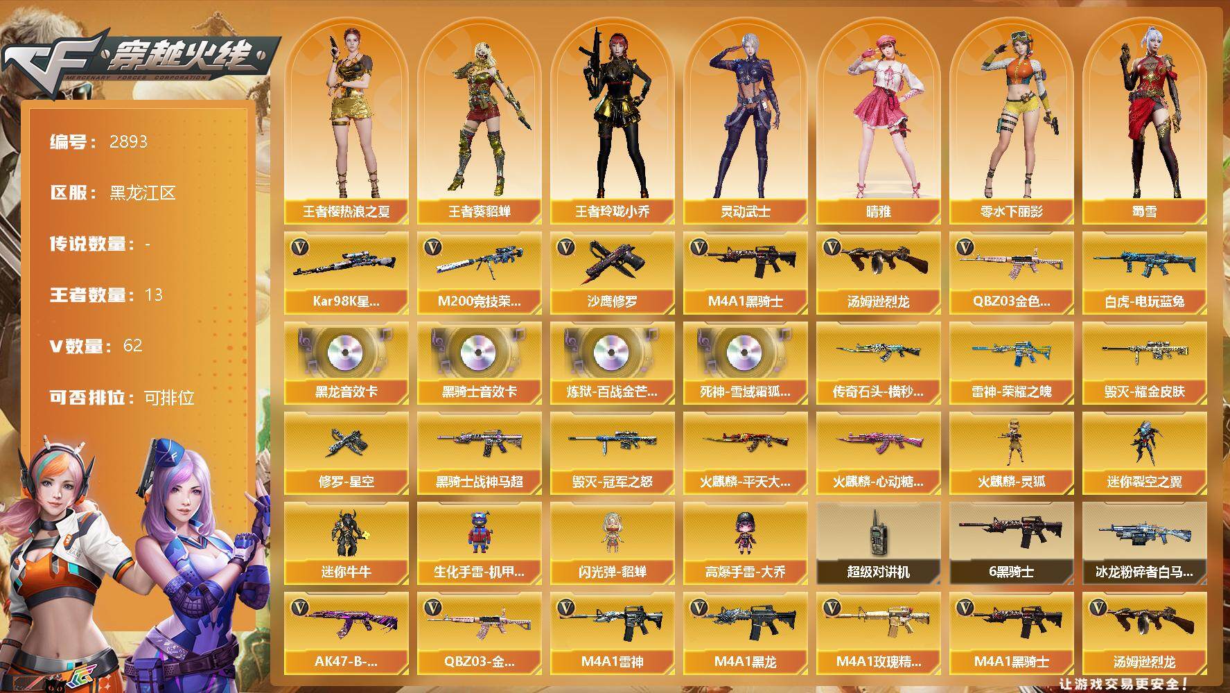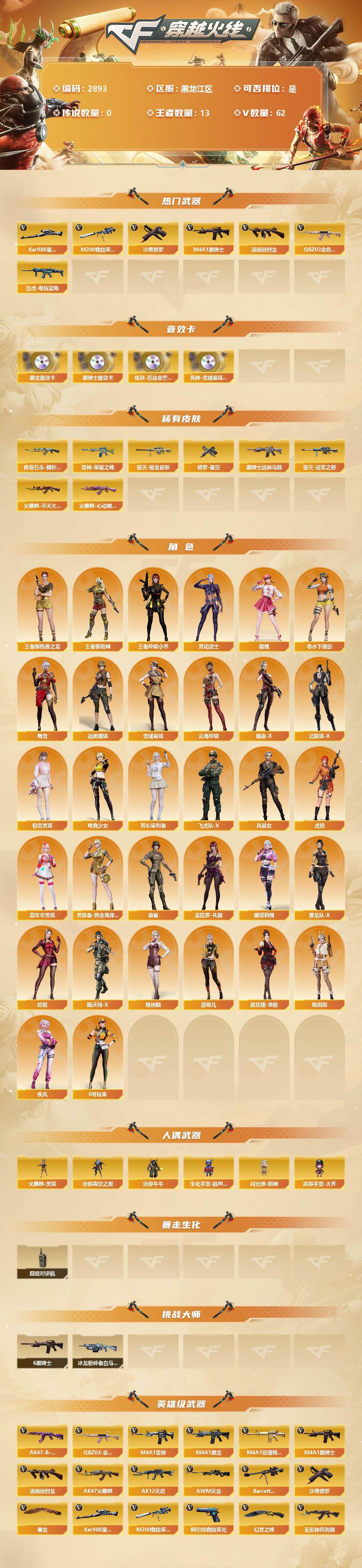 [13888742]黑龙江区-62V-13王者-0炫金 【热门武器】:QBZ03-金色蔷薇,M200-竞技荣光,白虎-电玩蓝兔,Kar98K-星神,M4A1-黑骑士*6,汤姆逊-烈龙,沙鹰-修罗*5 【音效卡】:M4A1-黑龙音效卡,M4A1-黑骑士音效卡,炼狱-百战金芒-庆典舞曲音效卡,死神-雪域霜狐-怀旧音效卡 【皮肤】:雷神-暗月,雷神-荣耀之魄,雷神-化蛇 皮肤,雷神-诺拉 皮肤,M4A1-再燃火线,传奇石头-横秒之巅,火麒麟-平天大圣,火麒麟-心动糖果,毁灭耀金皮肤,毁灭-冠军之怒,黑骑士-战神马超,玫瑰精灵-粉色浪漫 皮肤,战神-粉色甜心皮肤,AK47-B-常胜将军-曹操,AK47-B-常胜将军-刘备*2,AK47-B-常胜将军-孙权*2,修罗-星空,修罗-15周年嘉年华 皮肤,轻型军用手斧-再燃火线 【角色】:晴雅,战地猎狐,王者樱-热浪之夏,王者-葵-貂蝉,王者玲珑-小乔,雪域霜狐,云海玲珑,暗夜-X,北极狐-X,初恋灵狐,电竞少女,芳心审判者,飞虎队-X,风暴女,虎妞,嘉年华灵狐,疾风,0号玩家,灵动武士,零-水下丽影,灵狐者-黄金海岸,麻雀,曼陀罗-礼服,娜塔莉娅,潜龙队-X,蛇姬,斯沃特-X,蜀雪,兔囡囡,维纳斯,夜玫瑰-宠粉,游珑儿 【人偶武器】:火麒麟-灵狐,迷你裂空之翼,迷你牛牛,生化手雷-机甲核心,闪光弹-貂蝉,高爆手雷-大乔 【暴走生化】:超级对讲机 【挑战大师】:冰龙粉碎者-白马银枪 【英雄级武器】:AK47-火麒麟,M4A1-黑龙,M4A1-雷神*3,M4A1-黑骑士*6,AK12-天启,无影-神兵利器,黑武士-锦绣游龙,死神-雪域霜狐,M4A1-玫瑰精灵,QBZ03-金色蔷薇,王者之魄-觉醒版,黑骑士-海王*2,AK47-B-常胜将军,王者白虎-觉醒版,白虎-电玩蓝兔,AWM-天龙,Barrett-毁灭,Kar98K-星神,M200-竞技荣光,炼狱-百战金芒,汤姆逊-烈龙,烈龙-云海游龙,沙鹰-修罗*5,柯尔特-竞技荣光,屠龙,幻灵之锋*2,擎天-云海游龙,麒麟刺-百战金芒,王者之啸-觉醒版,王者之击-觉醒版*2,高爆手雷-幻灵,高爆手雷-竞技荣光*3,高爆手雷-神工天巧,手雷-云海游龙,闪光弹-幻灵,闪光弹-竞技荣光*2,烟雾弹-幻灵,烟雾弹-竞技荣光*2,M4A1-赤狱骑士,AWM-昌龙 【特殊枪械】:6黑骑士,1烈龙