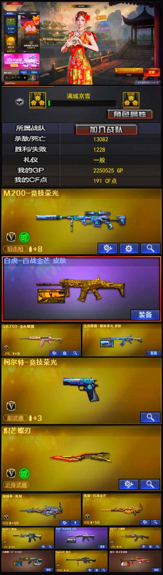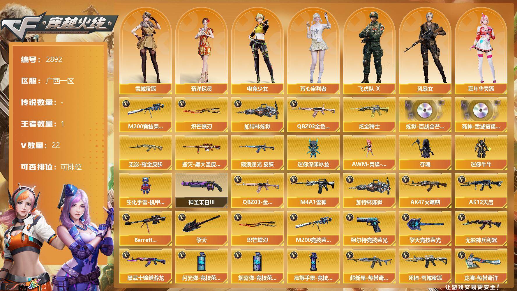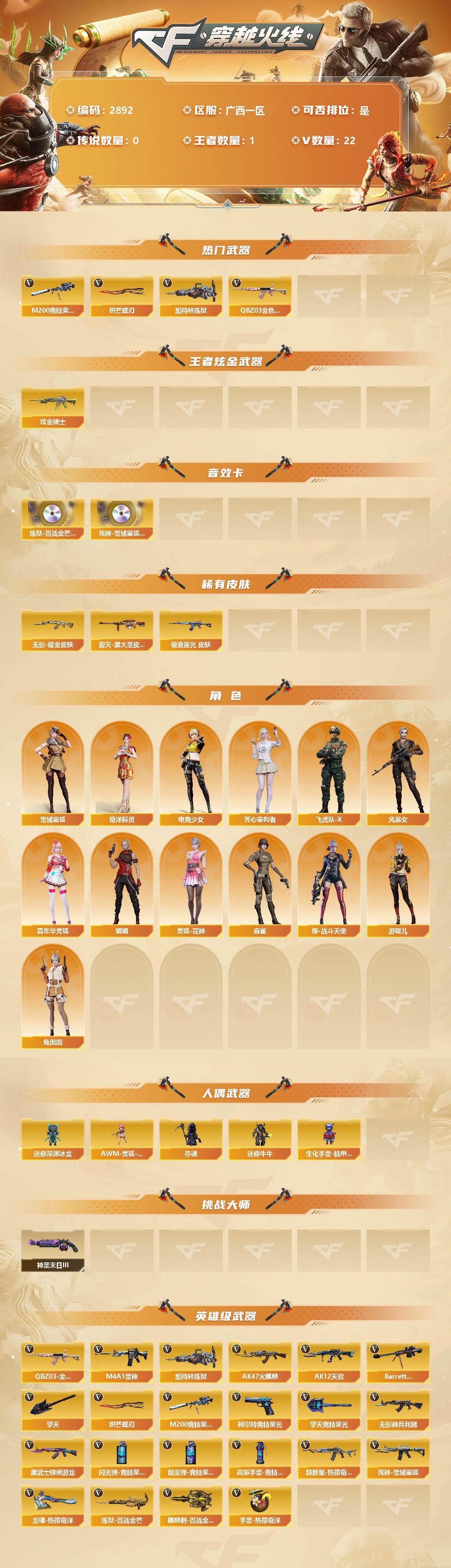 [13888911]广西一区-22V-1王者-1炫金 【热门武器】:QBZ03-金色蔷薇,M200-竞技荣光,加特林-炼狱,炽芒蝶刃 【王者炫金武器】:炫金骑士 【音效卡】:炼狱-百战金芒-庆典舞曲音效卡,死神-雪域霜狐-怀旧音效卡 【皮肤】:白虎-百战金芒 皮肤,金色蔷薇-破浪逐光 皮肤,雷神-雪域霜狐 皮肤,M4A1-再燃火线,毁灭-黑大圣皮肤,无影耀金皮肤,修罗-百战金芒 皮肤,轻型军用手斧-再燃火线 【角色】:雪域霜狐,奇洋探员,电竞少女,芳心审判者,飞虎队-X,风暴女,嘉年华灵狐,娟娟,灵狐-花神,麻雀,兔囡囡,樱-战斗天使,游珑儿 【人偶武器】:AWM-灵狐-15周年嘉年华,迷你深渊冰龙,夺魂,迷你牛牛,生化手雷-机甲核心 【挑战大师】:神圣爆裂者-末日III 【英雄级武器】:AK47-火麒麟,M4A1-雷神,AK12-天启,无影-神兵利器,黑武士-锦绣游龙,超新星-热带奇洋,死神-雪域霜狐,QBZ03-金色蔷薇,Barrett-毁灭,M200-竞技荣光,加特林-炼狱,炼狱-百战金芒,柯尔特-竞技荣光,擎天,擎天-竞技荣光,炽芒蝶刃,龙啸-热带奇洋,麒麟刺-百战金芒,高爆手雷-竞技荣光,手雷-热带奇洋,闪光弹-竞技荣光,烟雾弹-竞技荣光 【特殊枪械】:1炼狱