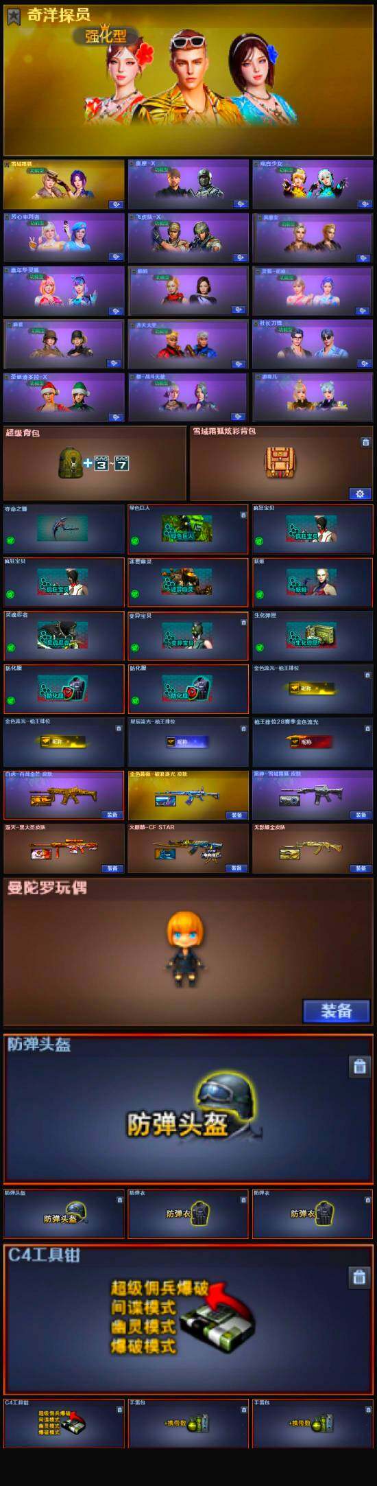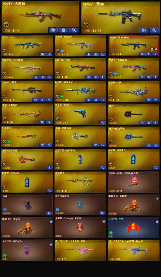 【英雄级武器】:AK47-火麒麟,M4A1-雷神,AK12-天启,无影-神兵利器,黑武士-锦绣游龙,超新星-热带奇洋,死神-雪域霜狐,QBZ03-金色蔷薇,Barrett-毁灭,M200-竞技荣光,加特林-炼狱,炼狱-百战金芒,柯尔特-竞技荣光,擎天,擎天-竞技荣光,炽芒蝶刃,龙啸-热带奇洋,麒麟刺-百战金芒,高爆手雷-竞技荣光,手雷-热带奇洋,闪光弹-竞技荣光,烟雾弹-竞技荣光