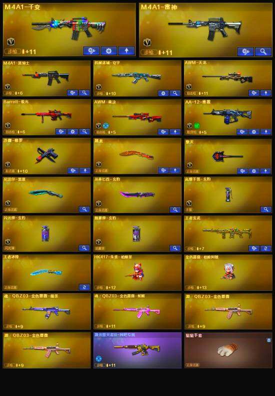 【英雄级武器】:M4A1-千变,M4A1-雷神,M4A1-黑骑士,AWM-天龙,Barrett-极光,AWM-裁决,AA-12-雷霆,沙鹰-修罗,屠龙,擎天,丛林匕首-玄豹,高爆手雷-玄豹,闪光弹-玄豹,烟雾弹-古蛇迷踪,烟雾弹-玄豹,M4A1-赤狱骑士