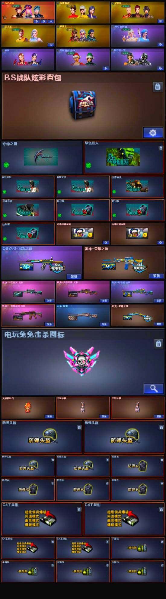 【道具】:BS战队炫彩背包,云山科技背包,亚洲杯纪念炫彩背包,战舰背包,女皇终结者-魔龙之吻,救世主-黑桃战神,黄金生化钩,绿色巨人,灵魂忍者,迷雾幽灵,夺命之镰,防化服*3,流光-鎏金之域,枪王排位29赛季金色流光,动感闪耀表情*2,防弹头盔*4,防弹衣*4,C4工具钳*4,手雷包*4