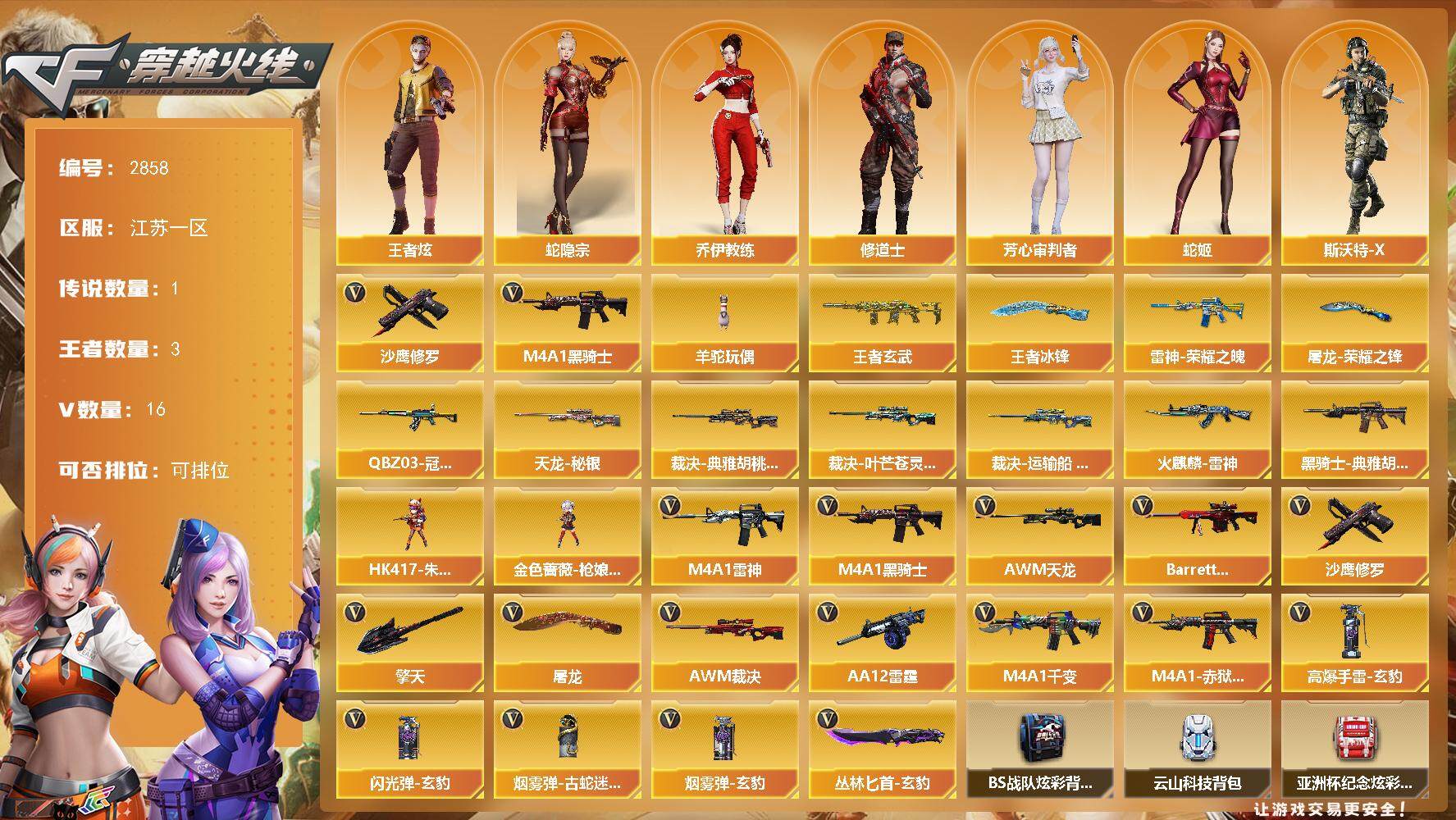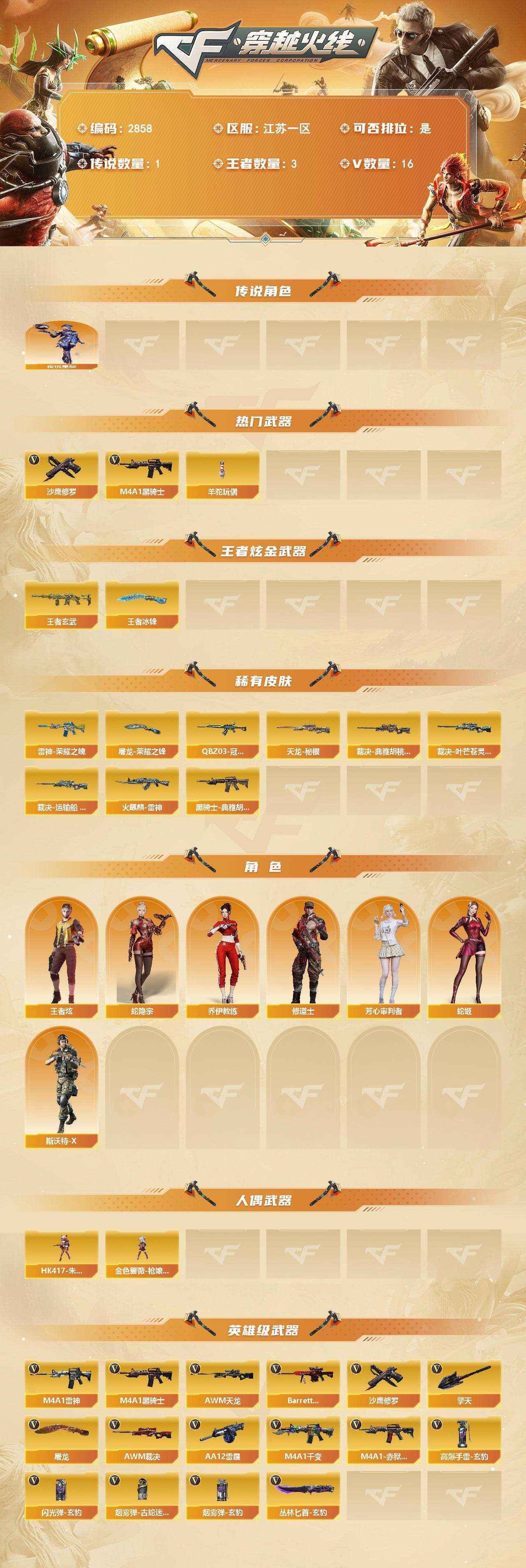 [13890358]江苏一区-16V-3王者-0炫金 【传说角色】:传说星骇 【热门武器】:M4A1-黑骑士,羊驼玩偶*2,沙鹰-修罗 【王者炫金武器】:王者玄武,王者冰锋 【皮肤】:QBZ03-冠军之薇,裁决-典雅胡桃 皮肤,裁决-叶芒苍灵 皮肤,裁决-运输船 皮肤,雷神-荣耀之魄,火麒麟-雷神,黑骑士-典雅胡桃 皮肤,天龙-秘银,屠龙-荣耀之锋 【角色】:王者炫,蛇隐宗,乔伊教练,修道士,芳心审判者,蛇姬,斯沃特-X 【人偶武器】:HK417-朱雀-枪娘菲,金色蔷薇-枪娘阿敏 【英雄级武器】:M4A1-千变,M4A1-雷神,M4A1-黑骑士,AWM-天龙,Barrett-极光,AWM-裁决,AA-12-雷霆,沙鹰-修罗,屠龙,擎天,丛林匕首-玄豹,高爆手雷-玄豹,闪光弹-玄豹,烟雾弹-古蛇迷踪,烟雾弹-玄豹,M4A1-赤狱骑士 【道具】:BS战队炫彩背包,云山科技背包,亚洲杯纪念炫彩背包,战舰背包,女皇终结者-魔龙之吻,救世主-黑桃战神,黄金生化钩,绿色巨人,灵魂忍者,迷雾幽灵,夺命之镰,防化服*3,流光-鎏金之域,枪王排位29赛季金色流光,动感闪耀表情*2,防弹头盔*4,防弹衣*4,C4工具钳*4,手雷包*4 【特殊枪械】:1黑骑士