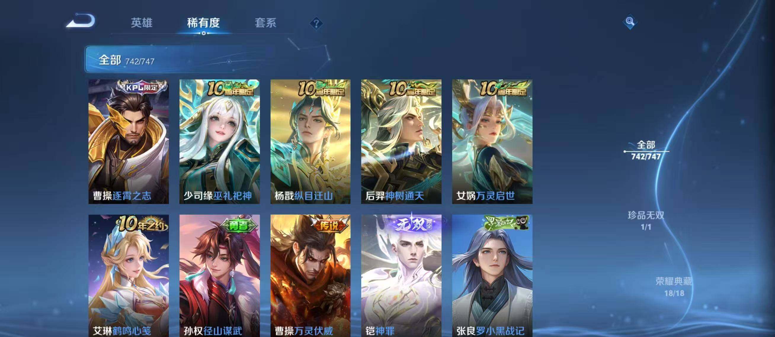 [13898493]安卓Q-V11-至尊星耀I段位-128英雄-742皮肤-18典藏-1珍品无双-12无双-9珍品传说-131传说-264史诗