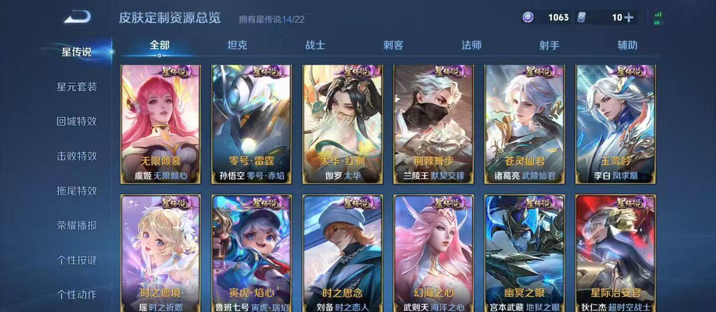 亚瑟狮心王,庄周蜃楼王,孙膑妖精王,扁鹊炼金王,虞姬凯尔特女王,白起狰,太乙真人饕餮,曹操烛龙,芈月重明,典韦穷奇,狂铁御狮,米莱狄御霄,牛魔御旌,盾山御銮,夏侯惇朔风刀,明世隐疑决卦,老夫子醍醐杖,鬼谷子原初探秘者,狄仁杰万华元夜,程咬金演武夺筹,钟馗驱傩正仪,苏烈千军破阵,吕布猎兽之王,嬴政白昼王子,女娲朔望之晖,典韦蓝屏警告,钟馗神迹守卫,鲁班七号狮舞东方,沈梦溪星空之诺,李元芳银河之约,刘邦夺宝奇兵,马可波罗暗影游猎,蒙犽狂想玩偶喵,元歌云间偶戏,弈星混沌棋,达摩沙漠行僧,兰陵王金庭之子,沈梦溪大漠名商,李元芳云中旅人,桑启海盐诗旅,裴擒虎擒涛扼浪,鲁班大师探海日志,张良古海寻踪,项羽苍威无极,镜青焰无极