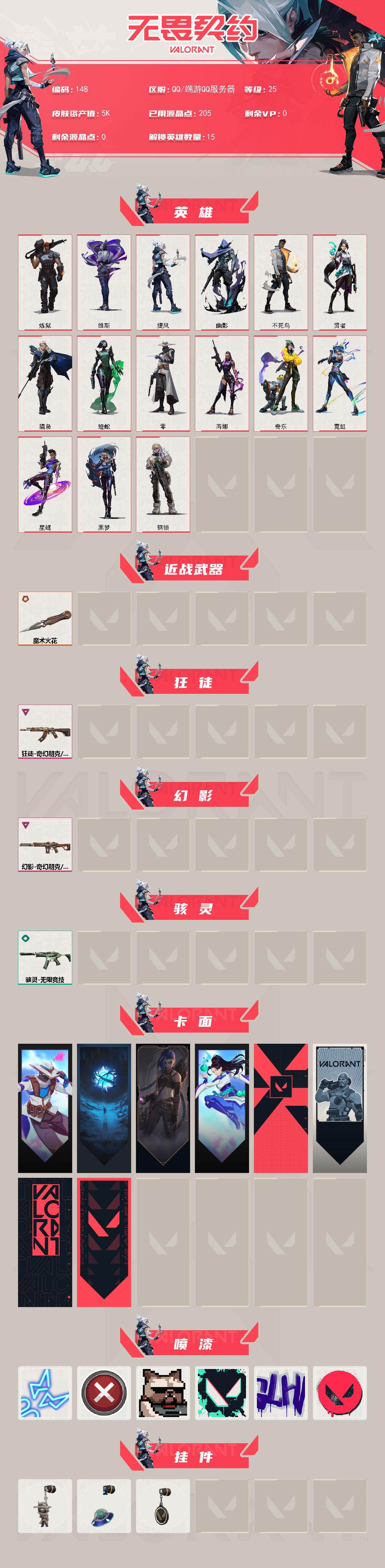[13904732]【英雄】:炼狱,维斯,捷风,幽影,不死鸟,贤者,猎枭,蝰蛇,零,芮娜,奇乐,霓虹,星礈,黑梦,钢锁 【近战 武器】:近战武器-魔术火花,近战武器-魔术火花 【狂徒】:狂徒-奇幻朋克//3.0 【幻影】:幻影-奇幻朋克//3.0 【骇灵】:骇灵-无限竞技 【卡面】:无畏契约GO!第一卷:零 卡面,无垠星环 卡面,《双城之战》金克丝 卡面,无畏契约GO!第一卷:贤者 卡面,代号红色 卡面,新兵报到 卡面,V契约 卡面,无畏契约 卡面 【喷漆】:霓光四射 喷漆,买装还是存钱 喷漆,关门放狗 喷漆,胜利属于无畏契约 喷漆,GLHF 喷漆,无畏契约 喷漆 【挂饰】:无畏契约GO!第一卷 零 挂饰,天外飞客 挂饰,无畏契约 纪念币 挂饰