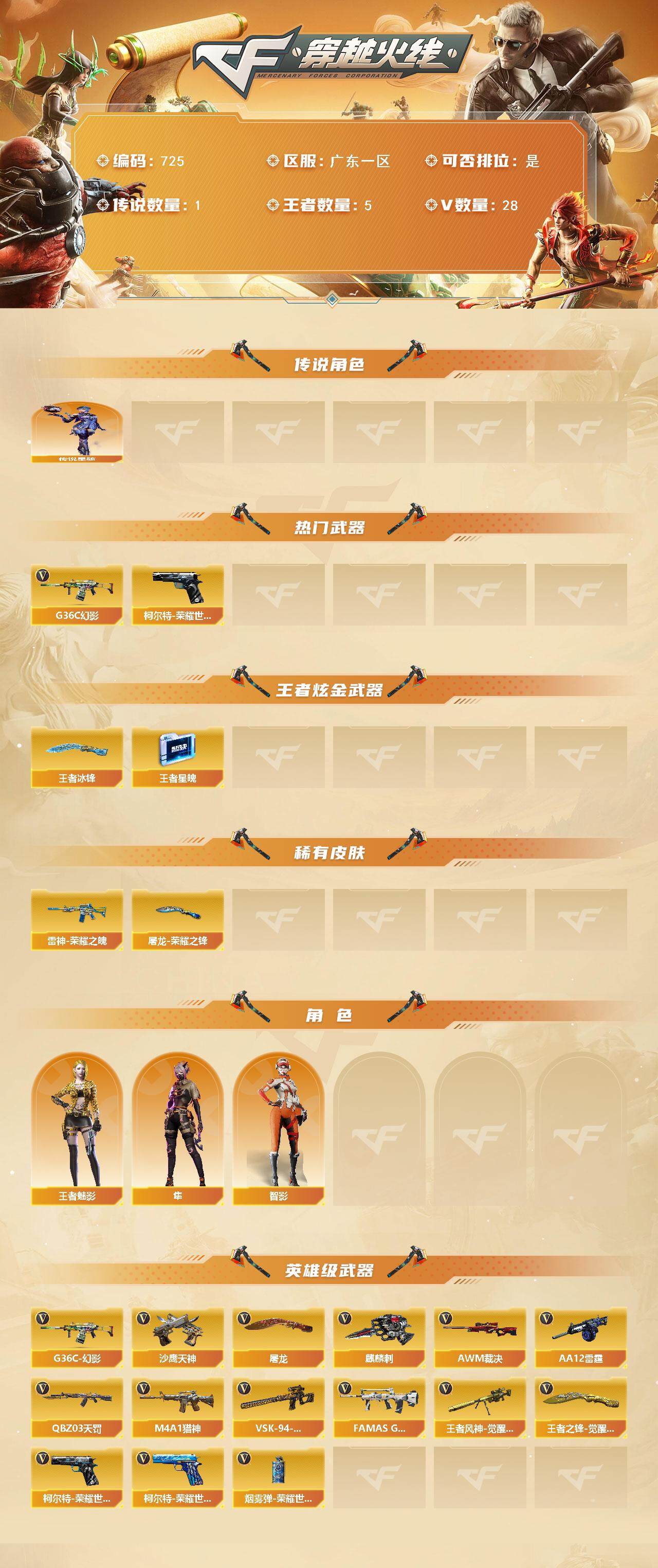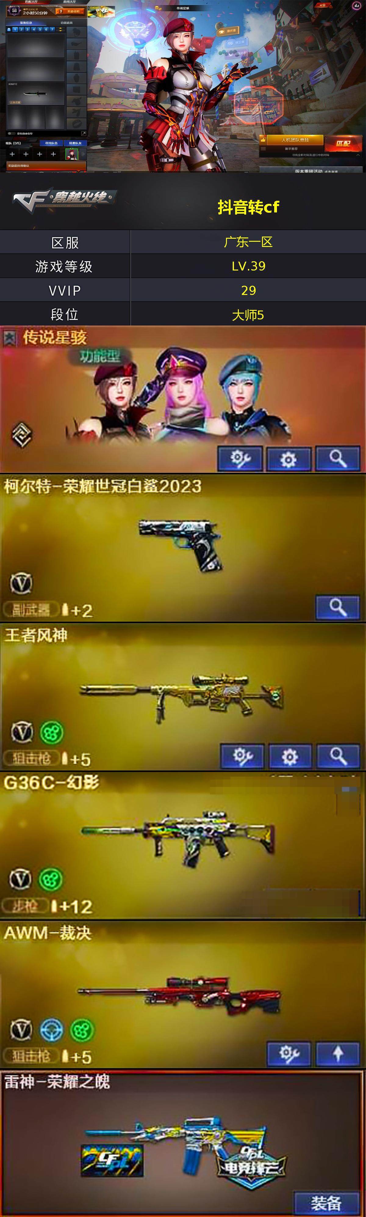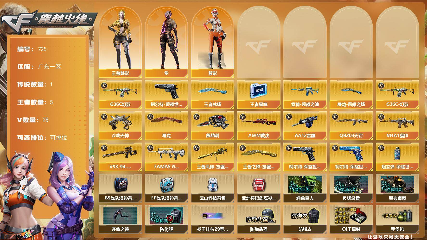 [13908823]广东一区-28V-5王者-0炫金 【传说角色】:传说星骇 【热门武器】:G36C-幻影,柯尔特-荣耀世冠白鲨2023 【王者炫金武器】:王者星魄,王者冰锋 【皮肤】:雷神-荣耀之魄,屠龙-荣耀之锋 【角色】:隼,妮妮,王者-魅影,智影 【英雄级武器】:QBZ03-天罚,G36C-幻影,FAMAS G2-天戎,M4A1-猎神,AWM-裁决,VSK-94-金蚀,王者风神-觉醒版,AA-12-雷霆,沙鹰-天神*6,柯尔特-荣耀世冠白鲨2023,柯尔特-荣耀世冠EP,屠龙,麒麟刺*4,王者之锋-觉醒版,烟雾弹-荣耀世冠EP*6 【道具】:BS战队炫彩背包,EP战队炫彩背包,云山科技背包,亚洲杯纪念炫彩背包,绿色巨人,灵魂忍者,迷雾幽灵,夺命之镰,防化服*3,枪王排位29赛季金色流光,EP战队收纳包,EP战队击杀图标,防弹头盔*3,防弹衣*3,C4工具钳*3,手雷包*3 【特殊枪械】: