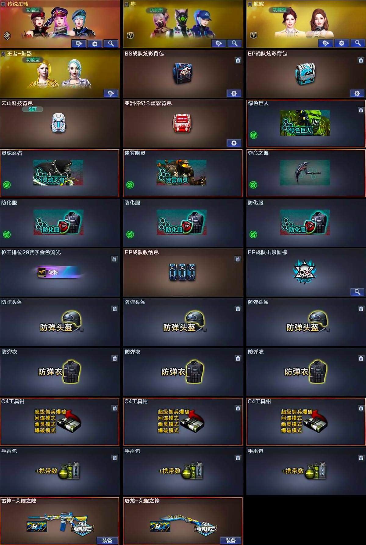 【道具】:BS战队炫彩背包,EP战队炫彩背包,云山科技背包,亚洲杯纪念炫彩背包,绿色巨人,灵魂忍者,迷雾幽灵,夺命之镰,防化服*3,枪王排位29赛季金色流光,EP战队收纳包,EP战队击杀图标,防弹头盔*3,防弹衣*3,C4工具钳*3,手雷包*3