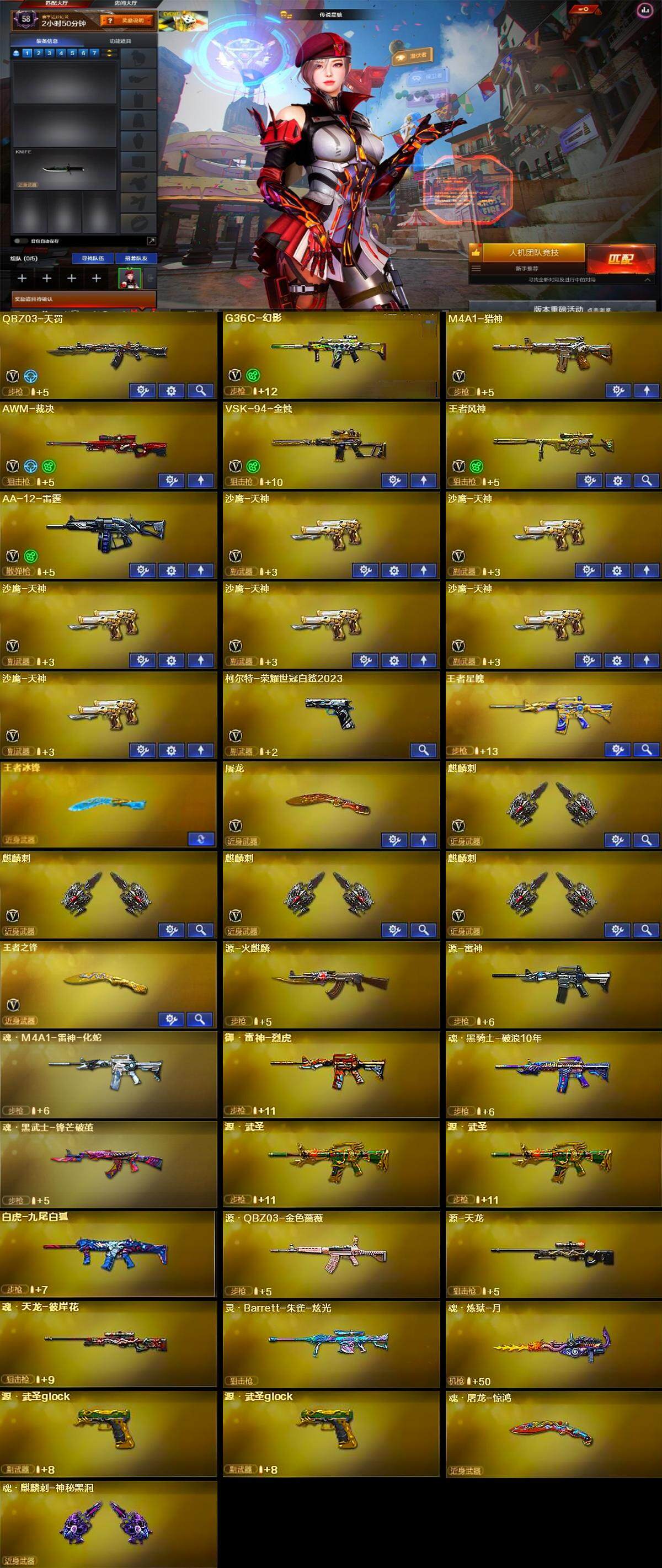 【英雄级武器】:QBZ03-天罚,G36C-幻影,FAMAS G2-天戎,M4A1-猎神,AWM-裁决,VSK-94-金蚀,王者风神-觉醒版,AA-12-雷霆,沙鹰-天神*6,柯尔特-荣耀世冠白鲨2023,柯尔特-荣耀世冠EP,屠龙,麒麟刺*4,王者之锋-觉醒版,烟雾弹-荣耀世冠EP*6