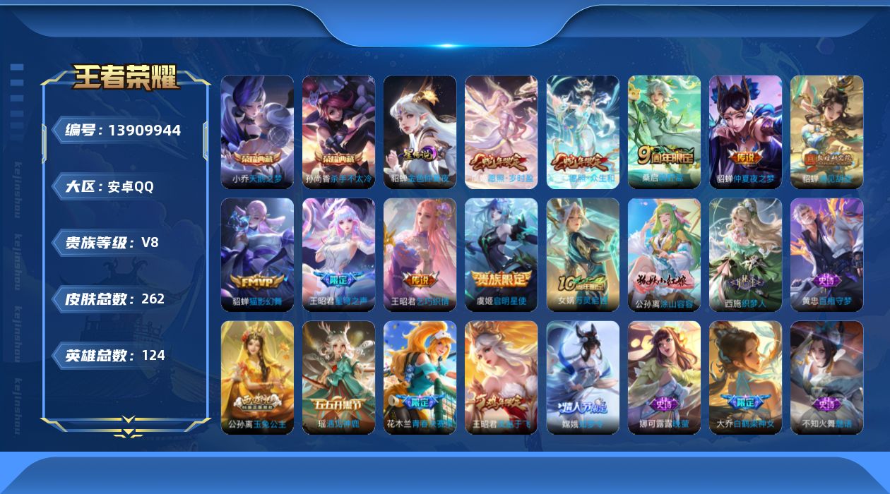 [13909944]【店主推荐捡漏号!可直接换绑】安卓Q-V8-永恒钻石I段位-124英雄-262皮肤-2典藏-10传说-75史诗