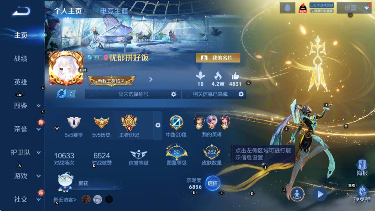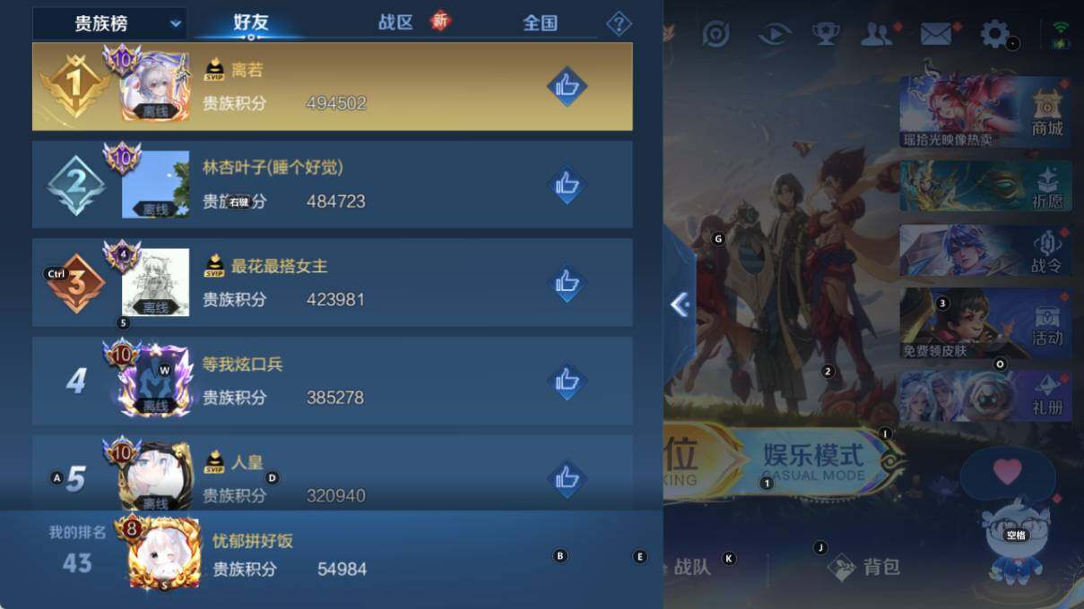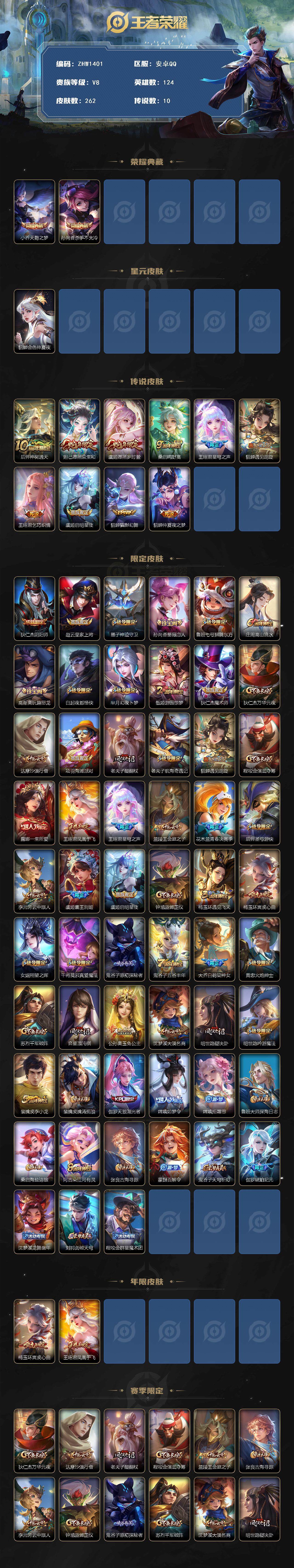 - PX_2093932-实名: 可修改 贵族等级: V5 英雄数: 98 皮肤数: 84 传说皮: 一念神魔,澜逐花归海 限定皮: 梁祝,鸣野蒿,愿照·九州拓