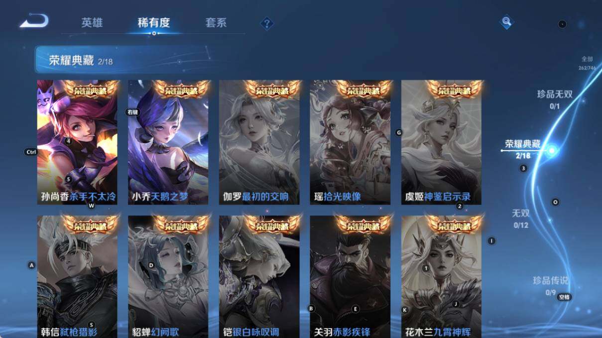 裴擒虎李小龙,伽罗天狼溯光者,王昭君凤凰于飞,虞姬霸王别姬,露娜一生所爱,嫦娥如梦令,花木兰青春决赛季,大乔白鹤梁神女,杨玉环寅虎·心曲,公孙离玉兔公主,王昭君星穹之声,桑启鸣野蒿,虞姬愿照·岁时盈,妲己愿照·众生和