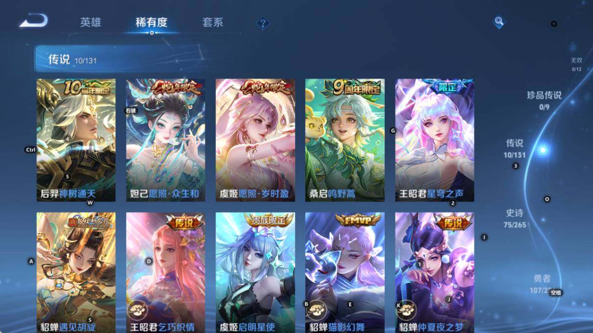 【传说皮肤】:后羿神树通天,妲己愿照众生和,虞姬愿照岁时盈,桑启鸣野蒿,王昭君星穹之声,貂蝉遇见胡旋,王昭君乞巧织情,虞姬启明星使,貂蝉猫影幻舞,貂蝉仲夏夜之梦