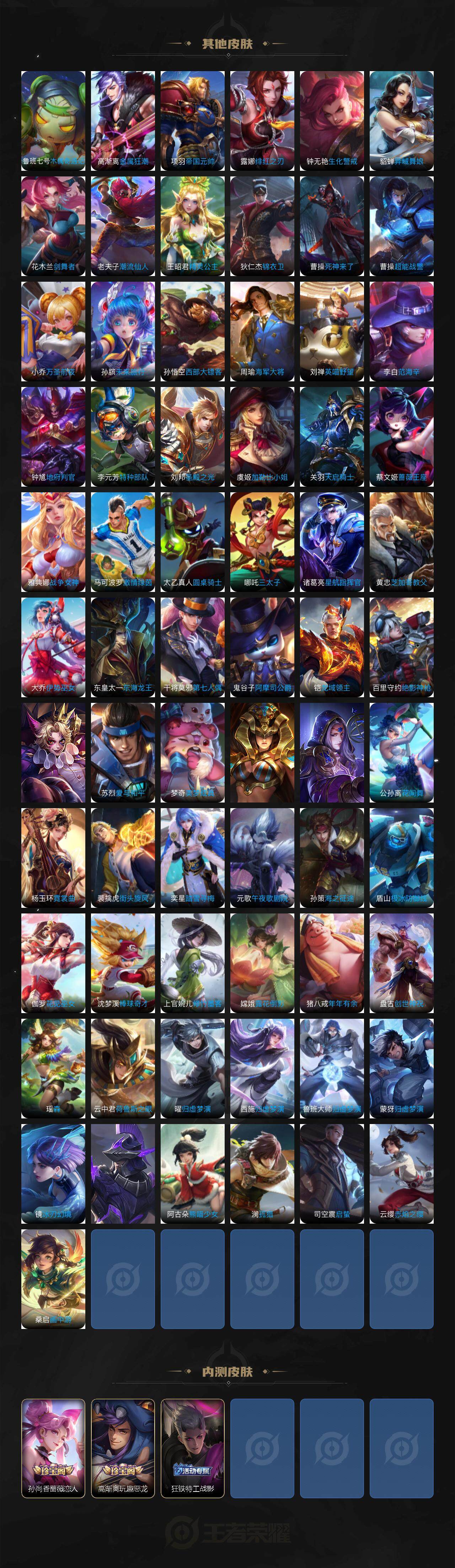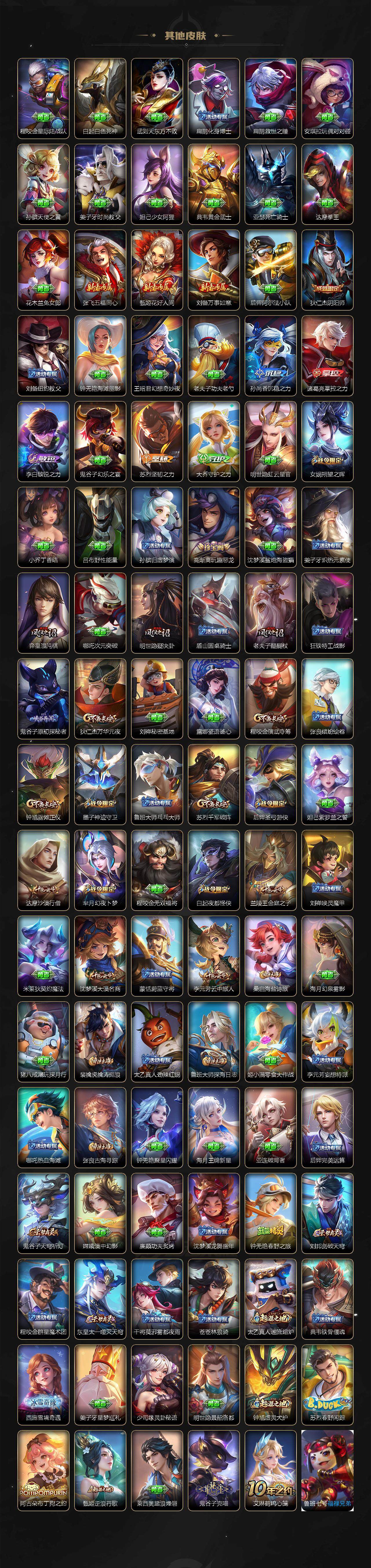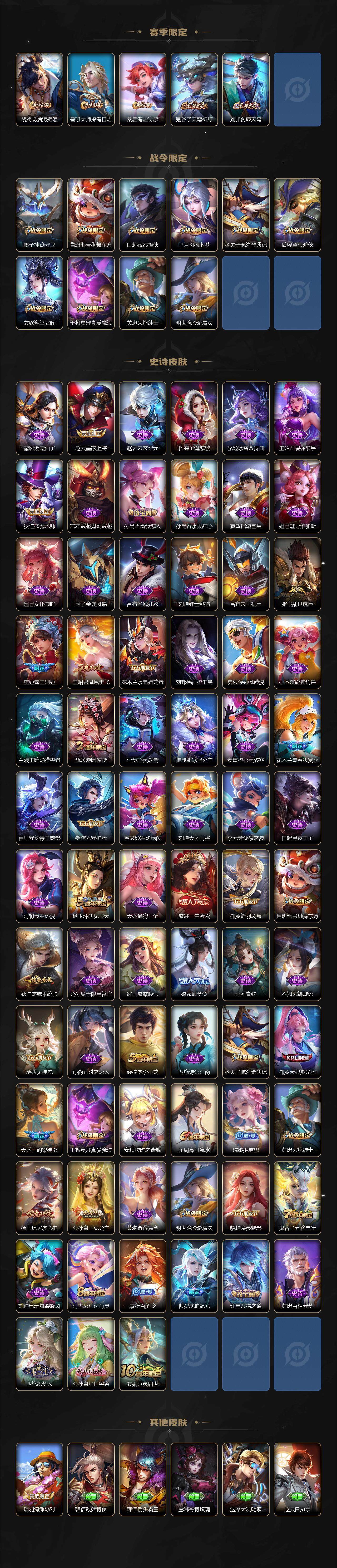 【限定皮肤】:狄仁杰阴阳师,赵云皇家上将,墨子神迹守卫,孙尚香蔷薇恋人,鲁班七号狮舞东方,庄周高山流水,高渐离玩趣恶龙,白起夜都怪侠,芈月幻夜卜梦,甄姬游园惊梦,狄仁杰魔术师,狄仁杰万华元夜,达摩沙漠行僧,项羽海滩派对,老夫子醍醐杖,老夫子航海奇遇记,貂蝉遇见胡旋,程咬金演武夺筹,露娜一生所爱,王昭君凤凰于飞,王昭君星穹之声,兰陵王金庭之子,花木兰青春决赛季,后羿圣弓游侠,李元芳云中旅人,虞姬霸王别姬,虞姬启明星使,钟馗驱傩正仪,杨玉环遇见飞天,杨玉环寅虎心曲,女娲朔望之晖,干将莫邪真爱魔法,鬼谷子原初探秘者,鬼谷子五谷丰年,大乔白鹤梁神女,黄忠火炮绅士,苏烈千军破阵,弈星混沌棋,公孙离玉兔公主,沈梦溪大漠名商,明世隐疑决卦,明世隐吟游魔法,裴擒虎李小龙,裴擒虎擒涛扼浪,伽罗天狼溯光者,嫦娥如梦令,嫦娥拒霜思,鲁班大师探海日志,桑启海盐诗旅,阿古朵江河有灵,张良古海寻踪,蒙犽百解令,鬼谷子天穹祈灯,伽罗琥珀纪元,沈梦溪龙舞盛年,刘邦剑破天穹,程咬金群星魔术团