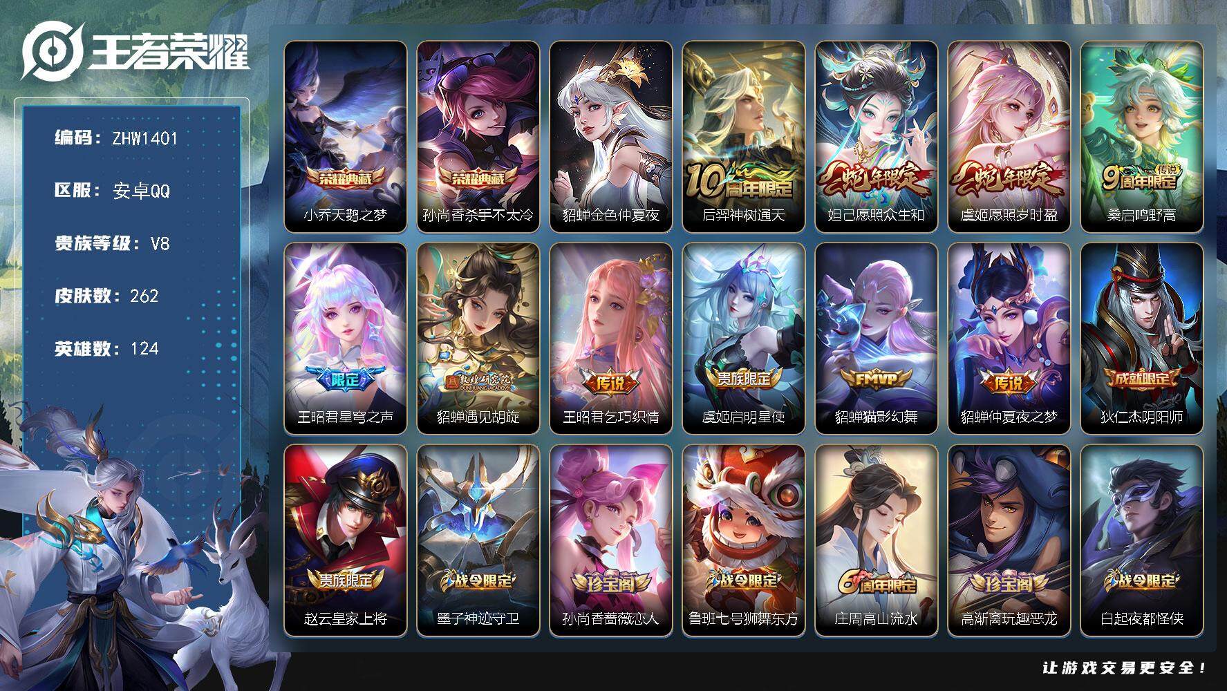 [13909944]【店主推荐捡漏号!可直接换绑】安卓Q-V8-永恒钻石I段位-124英雄-262皮肤-2典藏-10传说-75史诗 【英雄全皮】:鬼谷子全皮 【荣耀典藏】:小乔天鹅之梦,孙尚香杀手不太冷 【传说皮肤】:后羿神树通天,妲己愿照众生和,虞姬愿照岁时盈,桑启鸣野蒿,王昭君星穹之声,貂蝉遇见胡旋,王昭君乞巧织情,虞姬启明星使,貂蝉猫影幻舞,貂蝉仲夏夜之梦 【限定皮肤】:狄仁杰阴阳师,赵云皇家上将,墨子神迹守卫,孙尚香蔷薇恋人,鲁班七号狮舞东方,庄周高山流水,高渐离玩趣恶龙,白起夜都怪侠,芈月幻夜卜梦,甄姬游园惊梦,狄仁杰魔术师,狄仁杰万华元夜,达摩沙漠行僧,项羽海滩派对,老夫子醍醐杖,老夫子航海奇遇记,貂蝉遇见胡旋,程咬金演武夺筹,露娜一生所爱,王昭君凤凰于飞,王昭君星穹之声,兰陵王金庭之子,花木兰青春决赛季,后羿圣弓游侠,李元芳云中旅人,虞姬霸王别姬,虞姬启明星使,钟馗驱傩正仪,杨玉环遇见飞天,杨玉环寅虎心曲,女娲朔望之晖,干将莫邪真爱魔法,鬼谷子原初探秘者,鬼谷子五谷丰年,大乔白鹤梁神女,黄忠火炮绅士,苏烈千军破阵,弈星混沌棋,公孙离玉兔公主,沈梦溪大漠名商,明世隐疑决卦,明世隐吟游魔法,裴擒虎李小龙,裴擒虎擒涛扼浪,伽罗天狼溯光者,嫦娥如梦令,嫦娥拒霜思,鲁班大师探海日志,桑启海盐诗旅,阿古朵江河有灵,张良古海寻踪,蒙犽百解令,鬼谷子天穹祈灯,伽罗琥珀纪元,沈梦溪龙舞盛年,刘邦剑破天穹,程咬金群星魔术团 【年限皮肤】:杨玉环寅虎心曲,王昭君凤凰于飞 【赛季限定】:狄仁杰万华元夜,达摩沙漠行僧,老夫子醍醐杖,程咬金演武夺筹,兰陵王金庭之子,张良古海寻踪,李元芳云中旅人,钟馗驱傩正仪,鬼谷子原初探秘者,苏烈千军破阵,弈星混沌棋,沈梦溪大漠名商,明世隐疑决卦,裴擒虎擒涛扼浪,鲁班大师探海日志,桑启海盐诗旅,鬼谷子天穹祈灯,刘邦剑破天穹 【战令限定】:墨子神迹守卫,鲁班七号狮舞东方,白起夜都怪侠,芈月幻夜卜梦,老夫子航海奇遇记,后羿圣弓游侠,女娲朔望之晖,干将莫邪真爱魔法,黄忠火炮绅士,明世隐吟游魔法 【史诗皮肤】:露娜紫霞仙子,赵云皇家上将,赵云未来纪元,貂蝉圣诞恋歌,甄姬冰雪圆舞曲,王昭君偶像歌手,狄仁杰魔术师,宫本武藏鬼剑武藏,孙尚香蔷薇恋人,孙尚香水果甜心,嬴政摇滚巨星,妲己魅力维加斯,妲己女仆咖啡,墨子金属风暴,吕布圣诞狂欢,刘禅绅士熊喵,吕布末日机甲,张飞乱世虎臣,