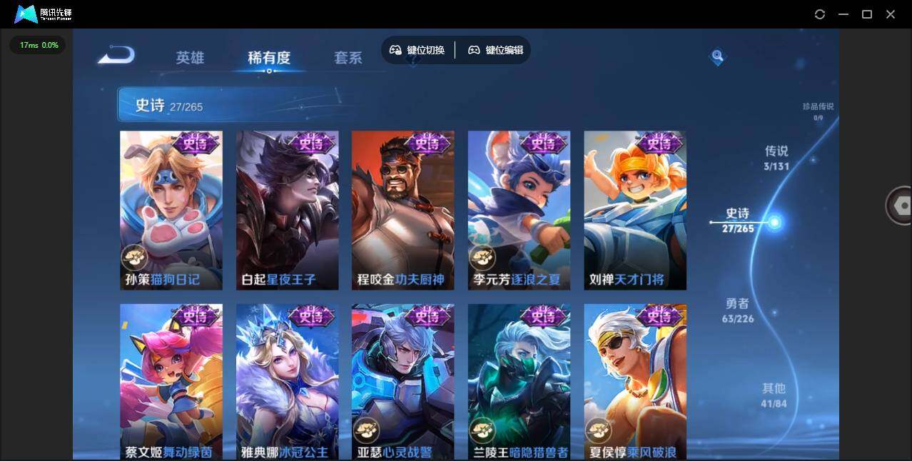 【史诗皮肤】:露娜紫霞仙子,赵云皇家上将,甄姬冰雪圆舞曲,王昭君偶像歌手,狄仁杰魔术师,宫本武藏鬼剑武藏,孙尚香水果甜心,嬴政暗夜贵公子,妲己魅力维加斯,墨子金属风暴,吕布圣诞狂欢,刘邦德古拉伯爵,夏侯惇乘风破浪,兰陵王暗隐猎兽者,亚瑟心灵战警,雅典娜冰冠公主,蔡文姬舞动绿茵,刘禅天才门将,李元芳逐浪之夏,程咬金功夫厨神,白起星夜王子,孙策猫狗日记,狄仁杰鹰眼统帅,上官婉儿梁祝,百里玄策原初追逐者,裴擒虎李小龙,公孙离涂山容容