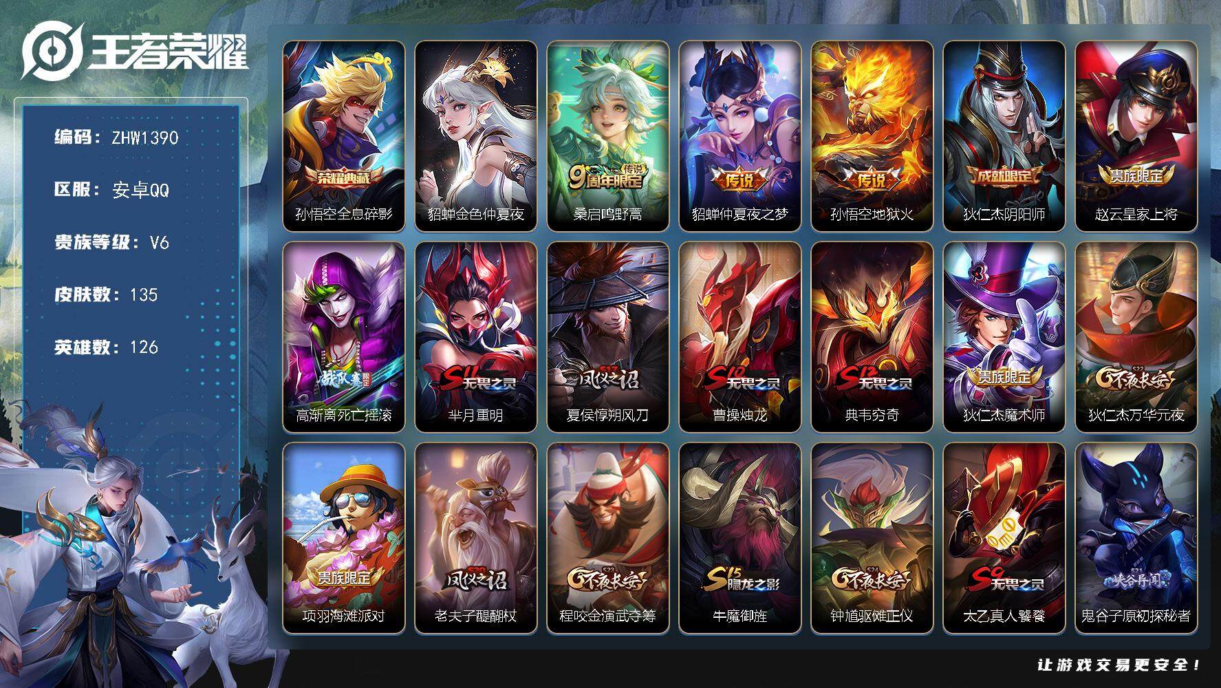 [13910090]有二次【店主推荐捡漏号!可直接换绑】安卓Q-V6-最强王者段位-126英雄-135皮肤-1典藏-1星传说-3传说-27史诗 【荣耀典藏】:孙悟空全息碎影 【传说皮肤】:桑启鸣野蒿,貂蝉仲夏夜之梦,孙悟空地狱火 【限定皮肤】:狄仁杰阴阳师,赵云皇家上将,高渐离死亡摇滚,芈月重明,夏侯惇朔风刀,曹操烛龙,典韦穷奇,狄仁杰魔术师,狄仁杰万华元夜,项羽海滩派对,老夫子醍醐杖,程咬金演武夺筹,牛魔御旌,钟馗驱傩正仪,太乙真人饕餮,鬼谷子原初探秘者,百里玄策原初追逐者,弈星混沌棋,明世隐疑决卦,裴擒虎李小龙,裴擒虎擒涛扼浪,狂铁御狮,米莱狄御霄,盾山御銮,上官婉儿梁祝,桑启海盐诗旅,张良古海寻踪,鬼谷子天穹祈灯,沈梦溪龙舞盛年 【赛季限定】:芈月重明,夏侯惇朔风刀,曹操烛龙,典韦穷奇,狄仁杰万华元夜,老夫子醍醐杖,程咬金演武夺筹,张良古海寻踪,牛魔御旌,钟馗驱傩正仪,太乙真人饕餮,鬼谷子原初探秘者,百里玄策原初追逐者,弈星混沌棋,明世隐疑决卦,裴擒虎擒涛扼浪,狂铁御狮,米莱狄御霄,盾山御銮,桑启海盐诗旅,鬼谷子天穹祈灯 【史诗皮肤】:露娜紫霞仙子,赵云皇家上将,甄姬冰雪圆舞曲,王昭君偶像歌手,狄仁杰魔术师,宫本武藏鬼剑武藏,孙尚香水果甜心,嬴政暗夜贵公子,妲己魅力维加斯,墨子金属风暴,吕布圣诞狂欢,刘邦德古拉伯爵,夏侯惇乘风破浪,兰陵王暗隐猎兽者,亚瑟心灵战警,雅典娜冰冠公主,蔡文姬舞动绿茵,刘禅天才门将,李元芳逐浪之夏,程咬金功夫厨神,白起星夜王子,孙策猫狗日记,狄仁杰鹰眼统帅,上官婉儿梁祝,百里玄策原初追逐者,裴擒虎李小龙,公孙离涂山容容 【其他皮肤】:项羽海滩派对,韩信教廷特使,韩信街头霸王,阿轲爱心护理,达摩大发明家,程咬金星际陆战队,白起白色死神,牛魔西部大镖客,扁鹊化身博士,安琪拉玩偶对对碰,孙膑天使之翼,妲己少女阿狸,典韦黄金武士,亚瑟死亡骑士,花木兰兔女郎,张飞五福同心,甄姬花好人间,刘备万事如意,宫本武藏万象初新,狄仁杰阴阳师,高渐离死亡摇滚,关羽龙腾万里,钟无艳海滩丽影,太乙真人饕餮,宫本武藏霸王丸,曹操烛龙,芈月重明,老夫子功夫老勺,牛魔制霸全明星,孙尚香沉稳之力,典韦穷奇,诸葛亮掌控之力,李白敏锐之力,鬼谷子幻乐之宴,狂铁御狮,大乔守护之力,项羽科学大爆炸,米莱狄御霄,牛魔御旌,盾山御銮,沈梦溪鲨炮海盗猫,夏侯惇朔风刀,弈星混沌棋,哪吒次元突破,明世隐
