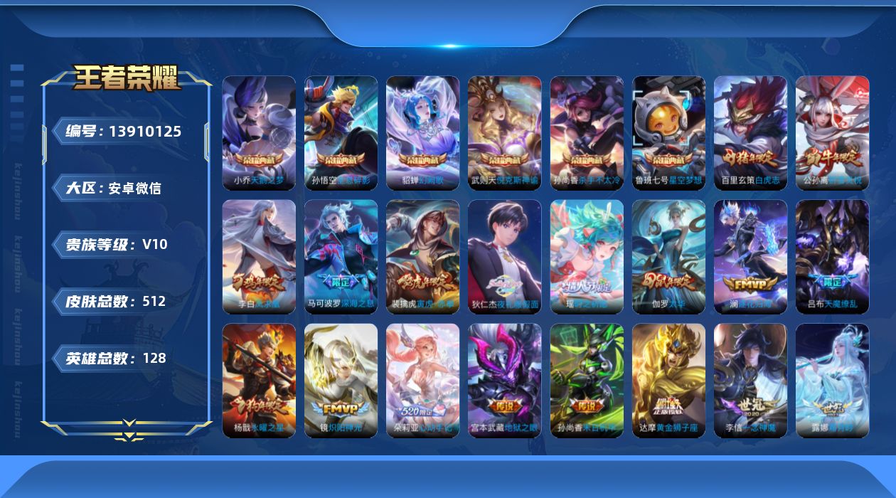 [13910125]安卓WX-V10-最强王者段位-128英雄-512皮肤-6典藏-0珍品无双-0无双-0珍品传说-63传说-180史诗