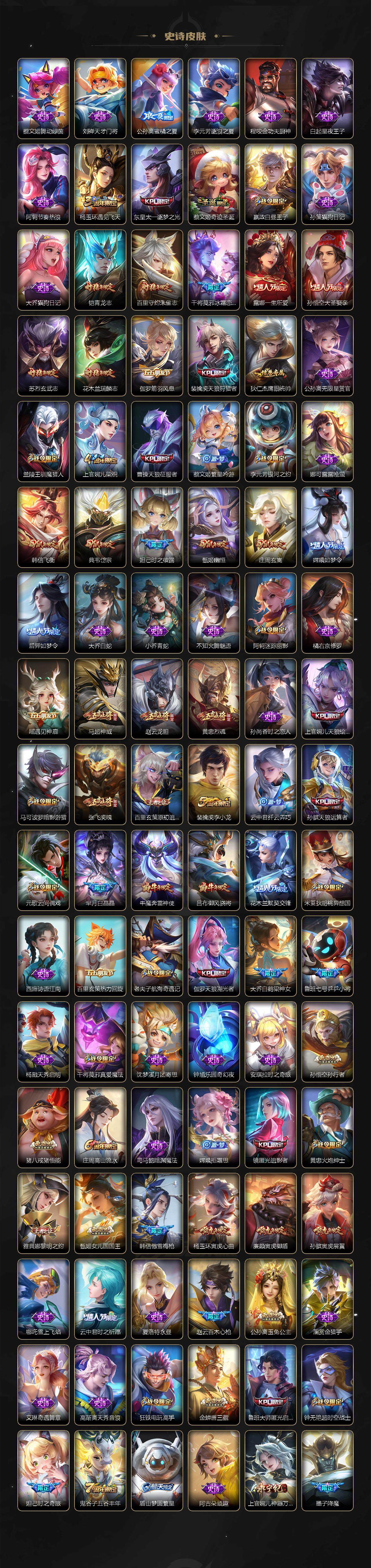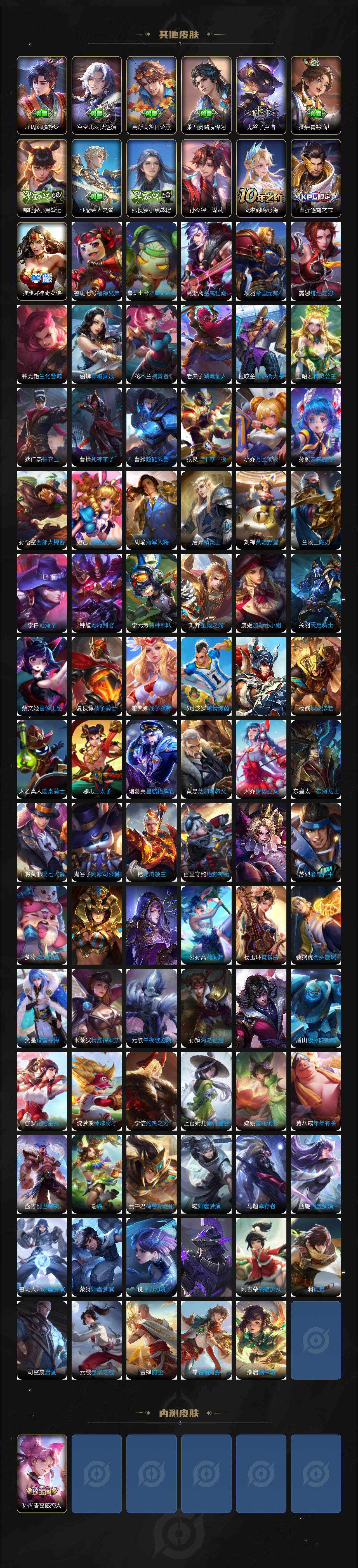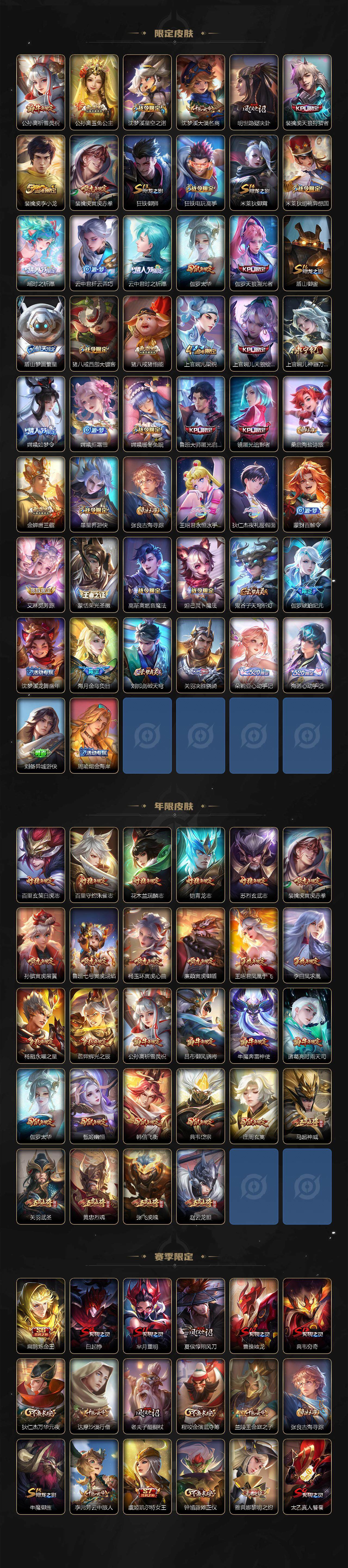 关羽冰锋战神,裴擒虎李小龙,上官婉儿梁祝,牛魔奔雷神使,公孙离祈雪灵祝,吕布御风骁将,诸葛亮时雨天司,赵云龙胆,关羽武圣,黄忠烈魂,张飞虎魄,马超神威,后羿辉光之辰,庄周玄嵩,典韦岱宗,甄姬幽恒,韩信飞衡,伽罗太华,曹操天狼征服者,裴擒虎天狼狩猎者,孙膑天狼运算者,上官婉儿天狼绘梦者,伽罗天狼溯光者,马可波罗逐梦之星,东皇太一逐梦之光,铠青龙志,百里玄策白虎志,花木兰瑞麟志,苏烈玄武志,百里守约朱雀志,王昭君凤凰于飞,项羽霸王别姬,虞姬霸王别姬,孙悟空大圣娶亲,露娜一生所爱,花木兰默契交锋,兰陵王默契交锋,后羿如梦令,嫦娥如梦令,孙悟空至尊宝,雅典娜神奇女侠,妲己热情桑巴,干将莫邪冰霜恋舞曲,花木兰青春决赛季,蔡文姬奇迹圣诞,妲己时之彼端,公孙离蜜橘之夏,芈月白晶晶,安琪拉魔法小厨娘,庄周云端筑梦师,鲁班七号乒乒小将,大乔白鹤梁神女,猪八戒猪悟能,廉颇寅虎·御盾,孙尚香异界灵契,孙悟空孙行者,甄姬女儿国国王,镜匿光追影者,韩信傲雪梅枪,鲁班七号寅虎·瑞焰,孙膑寅虎·展翼,杨玉环寅虎·心曲,裴擒虎寅虎·赤拳,云中君时之祈愿,瑶时之祈愿,女娲补天,赵云百木心枪,公孙离玉兔公主,露娜启示之音,后羿无尽星芒,马可波罗深海之息,金蝉唐三藏,娜可露露前尘镜,橘右京枫霜尽,鲁班大师匿光启智者,妲己时之奇旅,王昭君星穹之声,不知火舞绯月行,上官婉儿神器·万象笔,盾山梦圆繁星,墨子降魔,李白诗剑行,桑启鸣野蒿