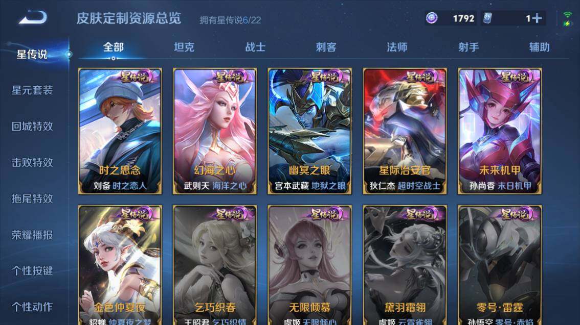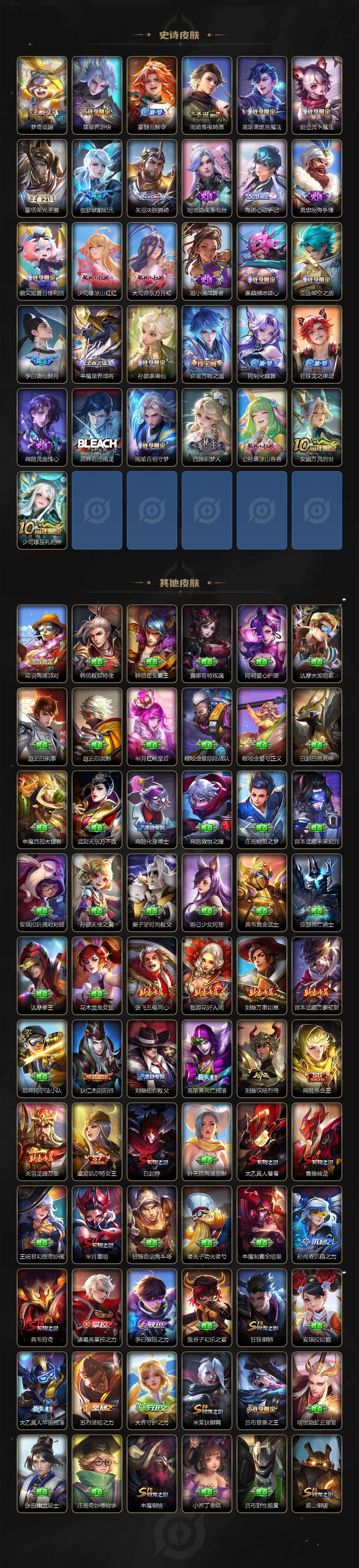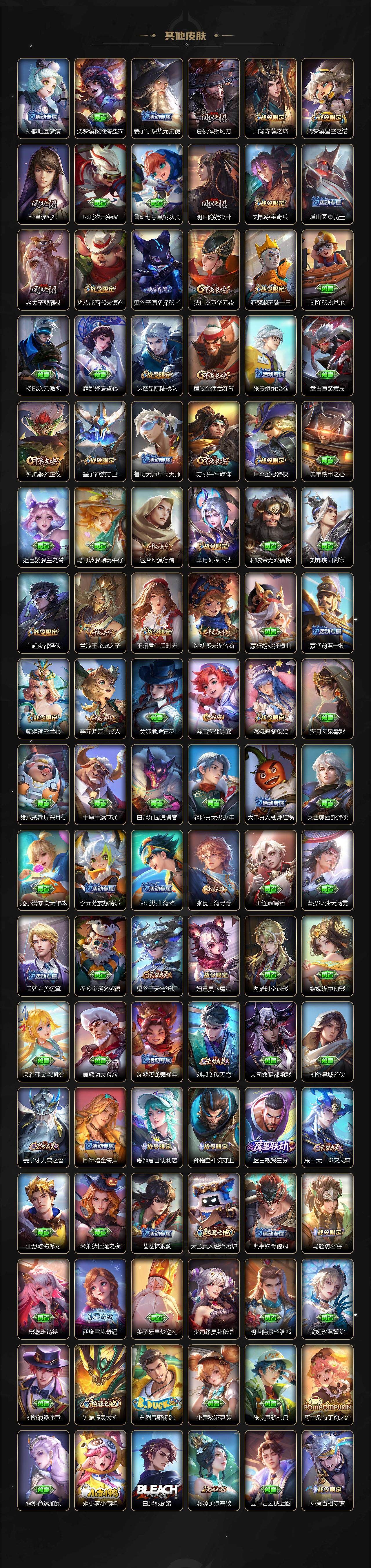 关羽冰锋战神,裴擒虎李小龙,上官婉儿梁祝,牛魔奔雷神使,公孙离祈雪灵祝,吕布御风骁将,诸葛亮时雨天司,赵云龙胆,关羽武圣,黄忠烈魂,张飞虎魄,马超神威,后羿辉光之辰,庄周玄嵩,典韦岱宗,甄姬幽恒,韩信飞衡,伽罗太华,曹操天狼征服者,裴擒虎天狼狩猎者,孙膑天狼运算者,上官婉儿天狼绘梦者,伽罗天狼溯光者,马可波罗逐梦之星,东皇太一逐梦之光,铠青龙志,百里玄策白虎志,花木兰瑞麟志,苏烈玄武志,百里守约朱雀志,王昭君凤凰于飞,项羽霸王别姬,虞姬霸王别姬,孙悟空大圣娶亲,露娜一生所爱,花木兰默契交锋,兰陵王默契交锋,后羿如梦令,嫦娥如梦令,孙悟空至尊宝,雅典娜神奇女侠,妲己热情桑巴,干将莫邪冰霜恋舞曲,花木兰青春决赛季,蔡文姬奇迹圣诞,妲己时之彼端,公孙离蜜橘之夏,芈月白晶晶,安琪拉魔法小厨娘,庄周云端筑梦师,鲁班七号乒乒小将,大乔白鹤梁神女,猪八戒猪悟能,廉颇寅虎·御盾,孙尚香异界灵契,孙悟空孙行者,甄姬女儿国国王,镜匿光追影者,韩信傲雪梅枪,鲁班七号寅虎·瑞焰,孙膑寅虎·展翼,杨玉环寅虎·心曲,裴擒虎寅虎·赤拳,云中君时之祈愿,瑶时之祈愿,女娲补天,赵云百木心枪,公孙离玉兔公主,露娜启示之音,后羿无尽星芒,马可波罗深海之息,金蝉唐三藏,娜可露露前尘镜,橘右京枫霜尽,鲁班大师匿光启智者,妲己时之奇旅,王昭君星穹之声,不知火舞绯月行,上官婉儿神器·万象笔,盾山梦圆繁星,墨子降魔,李白诗剑行,桑启鸣野蒿