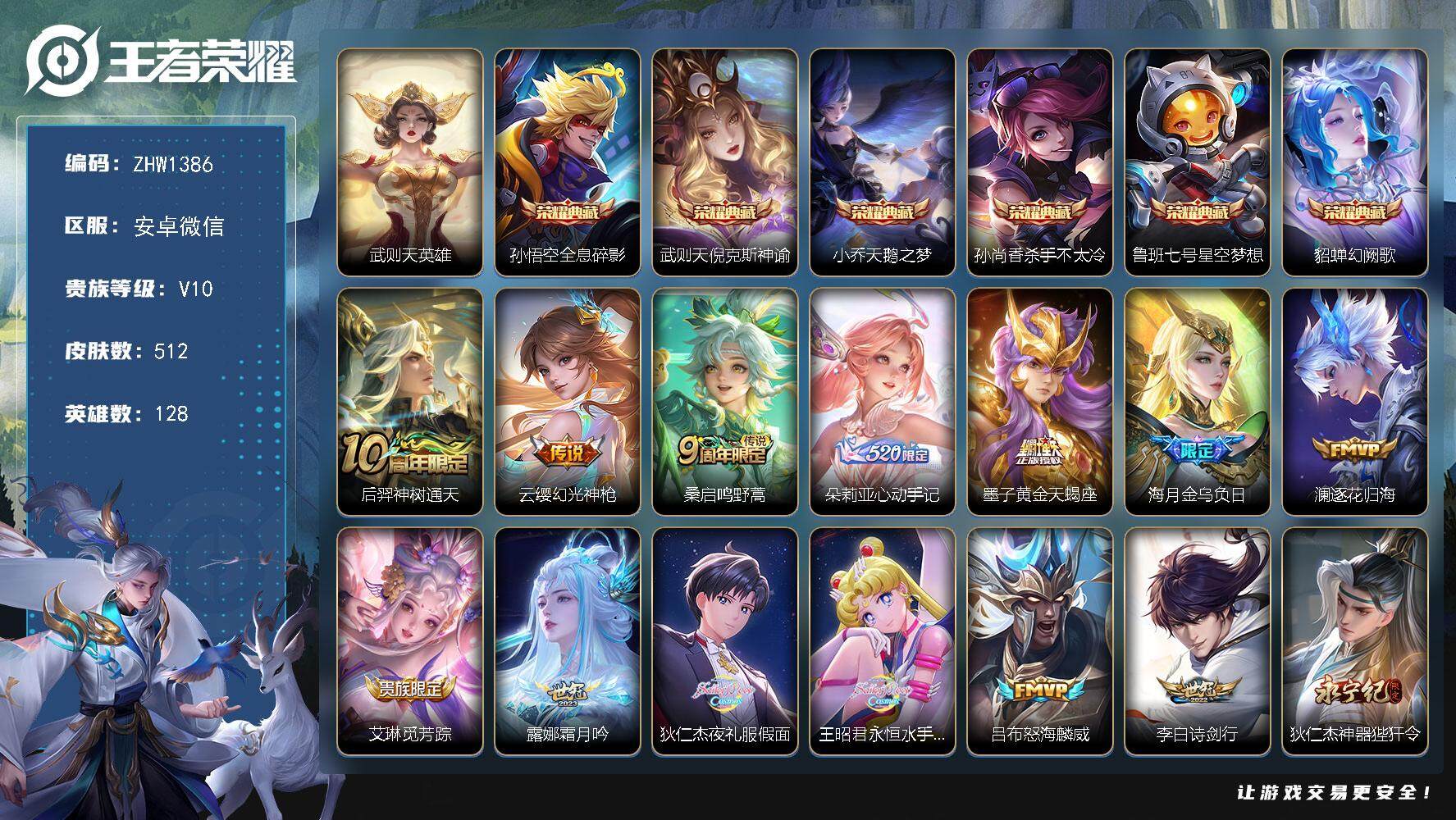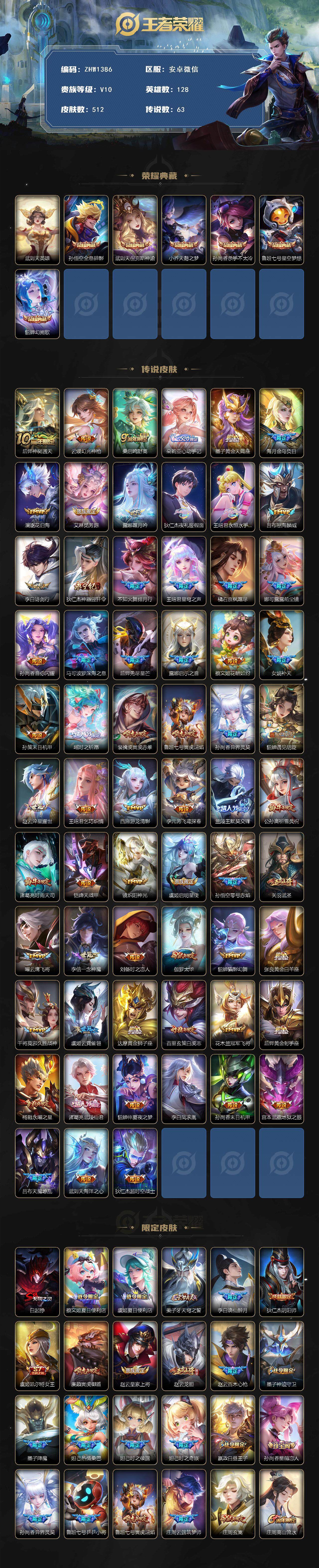[13910125]安卓WX-V10-最强王者段位-128英雄-512皮肤-6典藏-0珍品无双-0无双-0珍品传说-63传说-180史诗 【英雄全皮】:露娜全皮,刘邦全皮,孙权全皮,娜可露露全皮,橘右京全皮,太乙真人全皮,鬼谷子全皮,苏烈全皮,盾山全皮,猪八戒全皮,蒙恬全皮,金蝉全皮,空空儿全皮,影全皮,海诺全皮,少司缘全皮 【荣耀典藏】:武则天英雄,孙悟空全息碎影,武则天倪克斯神谕,小乔天鹅之梦,孙尚香杀手不太冷,鲁班七号星空梦想,貂蝉幻阙歌 【传说皮肤】:后羿神树通天,云缨幻光神枪,桑启鸣野蒿,朵莉亚心动手记,墨子黄金天蝎座,海月金乌负日,澜逐花归海,艾琳觅芳踪,露娜霜月吟,狄仁杰夜礼服假面,王昭君永恒水手月亮,吕布怒海麟威,李白诗剑行,狄仁杰神器狴犴令,不知火舞绯月行,王昭君星穹之声,橘右京枫霜尽,娜可露露前尘镜,孙尚香音你闪耀,马可波罗深海之息,后羿无尽星芒,露娜启示之音,蔡文姬花朝如约,女娲补天,孙策末日机甲,瑶时之祈愿,裴擒虎寅虎赤拳,鲁班七号寅虎瑞焰,孙尚香异界灵契,貂蝉遇见胡旋,赵云淬星耀世,王昭君乞巧织情,西施游龙清影,李元芳飞鸢探春,兰陵王默契交锋,公孙离祈雪灵祝,诸葛亮时雨天司,铠绛天战甲,镜炽阳神光,虞姬启明星使,孙悟空零号赤焰,关羽武圣,曜云鹰飞将,李信一念神魔,刘备时之恋人,伽罗太华,貂蝉猫影幻舞,张良黄金白羊座,干将莫邪久胜战神,虞姬云霓雀翎,达摩黄金狮子座,百里玄策白虎志,花木兰冠军飞将,后羿黄金射手座,杨戬永曜之星,诸葛亮武陵仙君,貂蝉仲夏夜之梦,李白凤求凰,孙尚香末日机甲,宫本武藏地狱之眼,吕布天魔缭乱,武则天海洋之心,狄仁杰超时空战士 【限定皮肤】:白起狰,蔡文姬夏日便利店,虞姬夏日便利店,姜子牙天穹之誓,李白谪仙醉月,狄仁杰阴阳师,虞姬凯尔特女王,廉颇寅虎御盾,赵云皇家上将,赵云龙胆,赵云百木心枪,墨子神迹守卫,墨子降魔,妲己热情桑巴,妲己时之彼端,妲己时之奇旅,嬴政白昼王子,孙尚香蔷薇恋人,孙尚香异界灵契,鲁班七号乒乒小将,鲁班七号寅虎瑞焰,庄周云端筑梦师,庄周玄嵩,庄周高山流水,高渐离死亡摇滚,阿轲迷踪丽影,钟无艳超时空战士,孙膑天狼运算者,孙膑寅虎展翼,扁鹊炼金王,白起夜都怪侠,芈月重明,芈月白晶晶,芈月幻夜卜梦,吕布天魔缭乱,吕布猎兽之王,吕布御风骁将,周瑜赤莲之焰,元歌云间偶戏,夏侯惇朔风刀,甄姬幽恒,甄姬女儿国国王,甄姬落雪兰心,曹