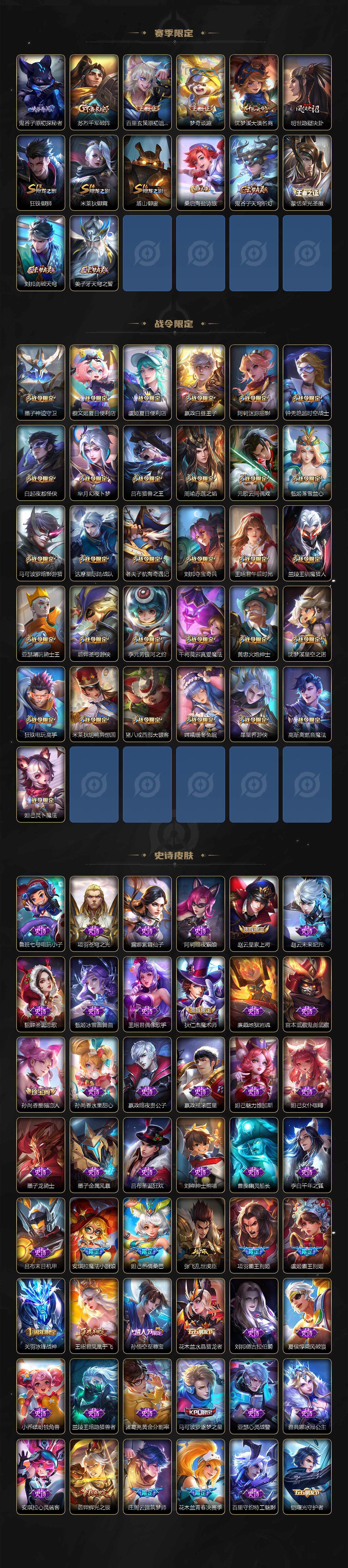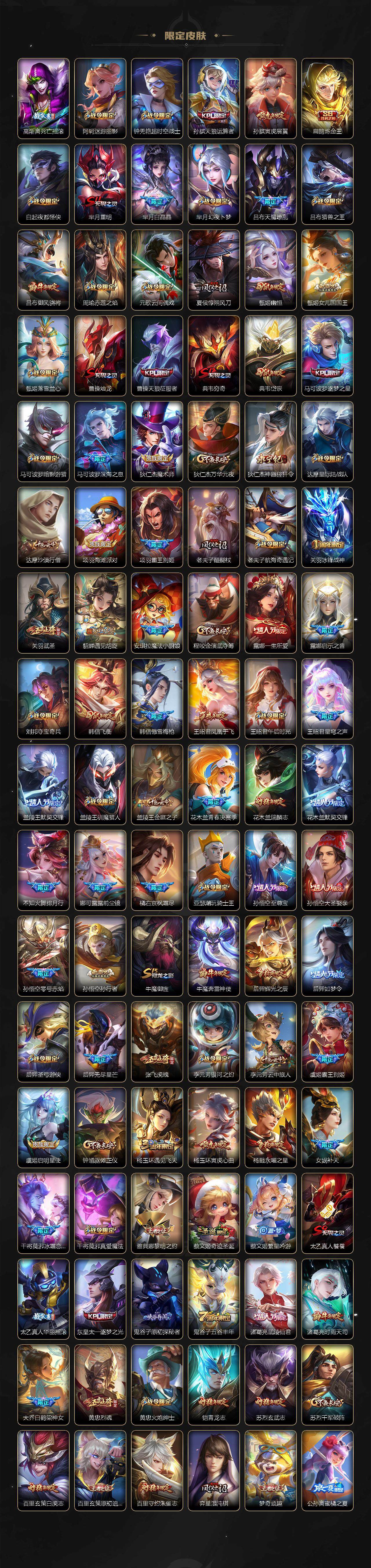 【限定皮肤】:白起狰,蔡文姬夏日便利店,虞姬夏日便利店,姜子牙天穹之誓,李白谪仙醉月,狄仁杰阴阳师,虞姬凯尔特女王,廉颇寅虎御盾,赵云皇家上将,赵云龙胆,赵云百木心枪,墨子神迹守卫,墨子降魔,妲己热情桑巴,妲己时之彼端,妲己时之奇旅,嬴政白昼王子,孙尚香蔷薇恋人,孙尚香异界灵契,鲁班七号乒乒小将,鲁班七号寅虎瑞焰,庄周云端筑梦师,庄周玄嵩,庄周高山流水,高渐离死亡摇滚,阿轲迷踪丽影,钟无艳超时空战士,孙膑天狼运算者,孙膑寅虎展翼,扁鹊炼金王,白起夜都怪侠,芈月重明,芈月白晶晶,芈月幻夜卜梦,吕布天魔缭乱,吕布猎兽之王,吕布御风骁将,周瑜赤莲之焰,元歌云间偶戏,夏侯惇朔风刀,甄姬幽恒,甄姬女儿国国王,甄姬落雪兰心,曹