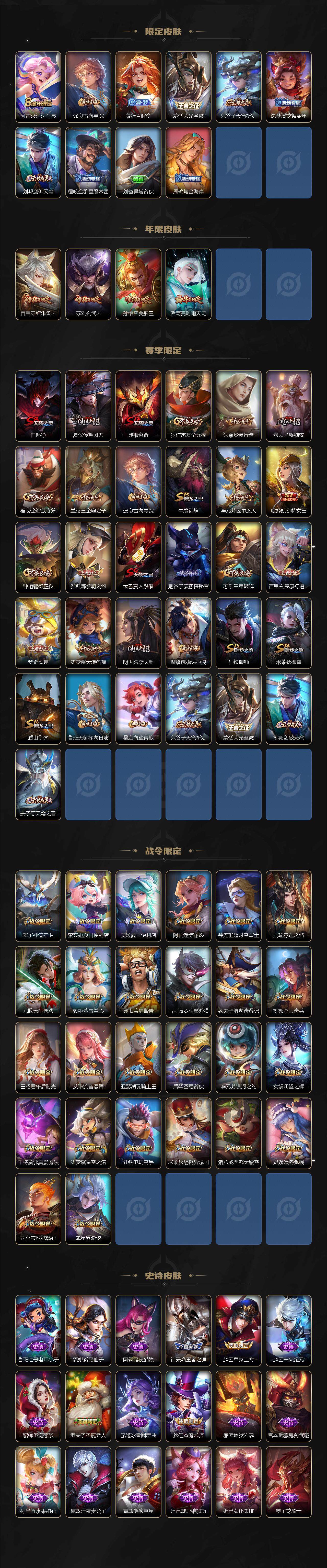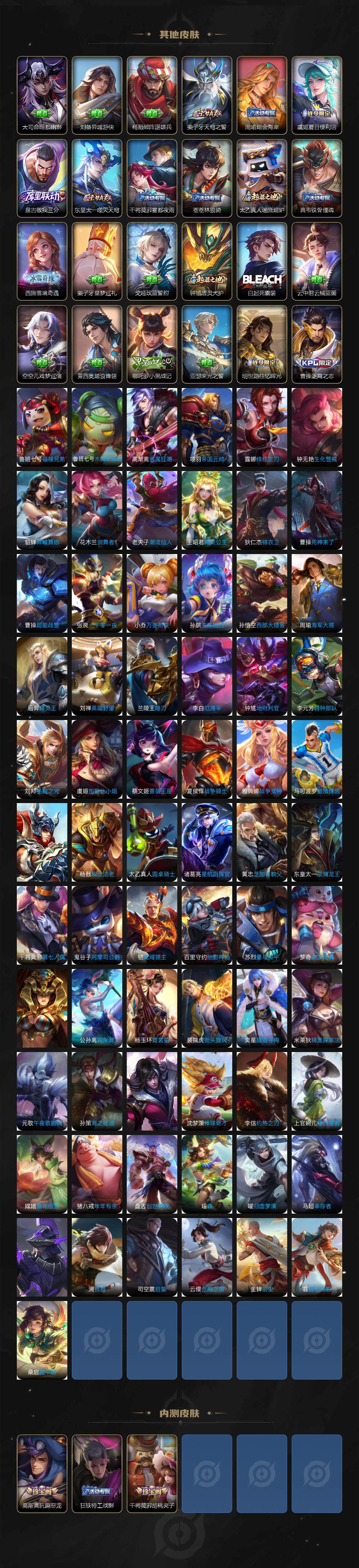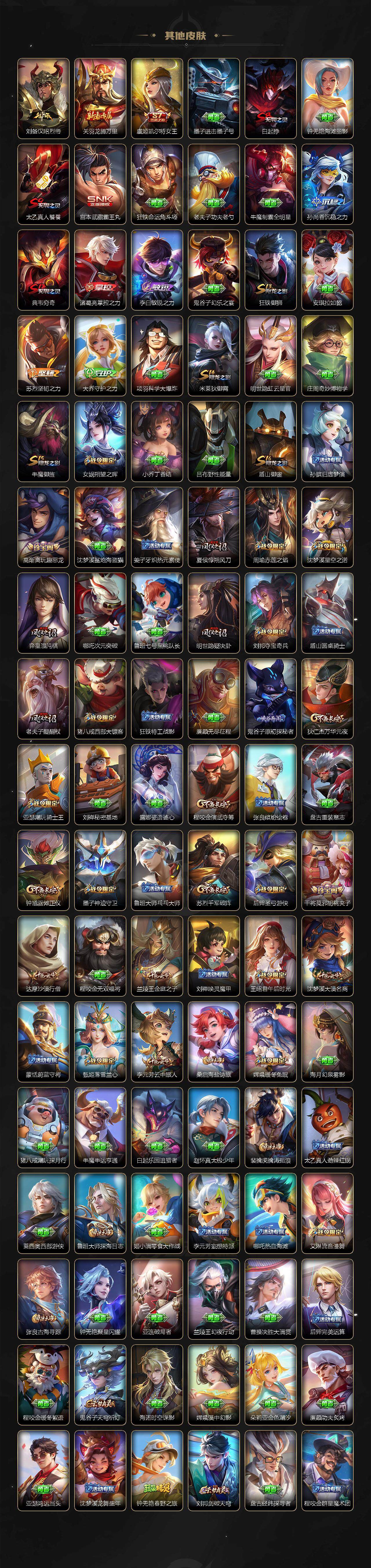 【限定皮肤】:白起狰,蔡文姬夏日便利店,虞姬夏日便利店,姜子牙天穹之誓,杨戬破阵退雄兵,狄仁杰阴阳师,虞姬凯尔特女王,赵云皇家上将,赵云引擎之心,墨子神迹守卫,鲁班七号乒乒小将,鲁班七号时之奇旅,高渐离玩趣恶龙,阿轲迷踪丽影,钟无艳王者之锤,钟无艳超时空战士,周瑜赤莲之焰,元歌云间偶戏,元歌无心,夏侯惇朔风刀,甄姬游园惊梦,甄姬落雪兰心,典韦穷奇,典韦蓝屏警告,马可波罗暗影游猎,狄仁杰魔术师,狄仁杰万华元夜,达摩沙漠行僧,项羽海滩派对,老夫子圣诞老人,老夫子醍醐杖,老夫子航海奇遇记,程咬金演武夺筹,刘邦夺宝奇兵,韩信傲雪梅枪,王昭君午后时光,兰陵王金庭之子,花木兰青春决赛季,亚瑟潮玩骑士王,孙悟空美猴王,孙悟空至尊宝,孙悟空孙行者,牛魔御旌,后羿圣弓游侠,李元芳银河之约,李元芳云中旅人,钟馗驱傩正仪,杨玉环遇见飞天,女娲朔望之晖,女娲补天,干将莫邪胡桃夹子,干将莫邪真爱魔法,雅典娜黎明之约,太乙真人饕餮,鬼谷子原初探秘者,鬼谷子五谷丰年,诸葛亮时雨天司,苏烈玄武志,苏烈千军破阵,百里玄策原初追逐者,百里守约朱雀志,弈星混沌棋,梦奇顽趣,沈梦溪星空之诺,沈梦溪大漠名商,明世隐疑决卦,裴擒虎李小龙,裴擒虎擒涛扼浪,狂铁御狮,狂铁电玩高手,米莱狄御霄,米莱狄胡桃异想国,云中君纤云弄巧,盾山御銮,猪八戒西部大镖客,上官婉儿梁祝,上官婉儿天狼绘梦者,嫦娥拒霜思,嫦娥暖冬兔眠,鲁班大师探海日志,桑启海盐诗旅,暃星界游侠,艾琳流音漫舞,司空震地狱燃心,阿古朵江河有灵,张良古海寻踪,蒙犽百解令,蒙恬荣光圣徽,鬼谷子天穹祈灯,沈梦溪龙舞盛年,刘邦剑破天穹,程咬金群星魔术团,刘备异域游侠,周瑜熔金海岸
