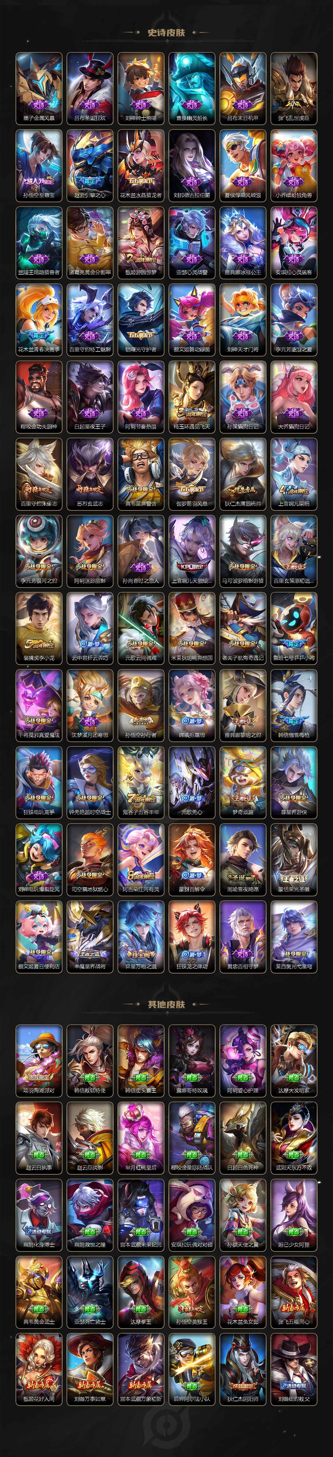 虞姬凯尔特女王,白起狰,太乙真人饕餮,典韦穷奇,狂铁御狮,米莱狄御霄,牛魔御旌,盾山御銮,夏侯惇朔风刀,明世隐疑决卦,老夫子醍醐杖,鬼谷子原初探秘者,狄仁杰万华元夜,程咬金演武夺筹,钟馗驱傩正仪,苏烈千军破阵,女娲朔望之晖,典韦蓝屏警告,沈梦溪星空之诺,李元芳银河之约,刘邦夺宝奇兵,马可波罗暗影游猎,元歌云间偶戏,弈星混沌棋,达摩沙漠行僧,兰陵王金庭之子,沈梦溪大漠名商,李元芳云中旅人,桑启海盐诗旅,裴擒虎擒涛扼浪,鲁班大师探海日志,张良古海寻踪