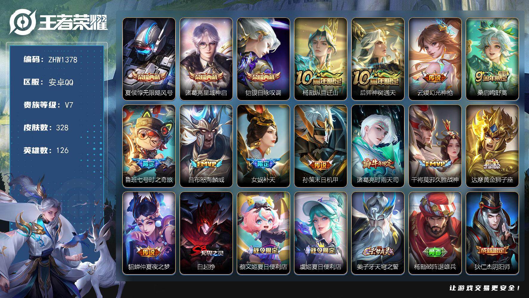[13910218]【店主推荐捡漏号!可直接换绑】安卓Q-V7-最强王者段位-126英雄-328皮肤-3典藏--12传说-90史诗