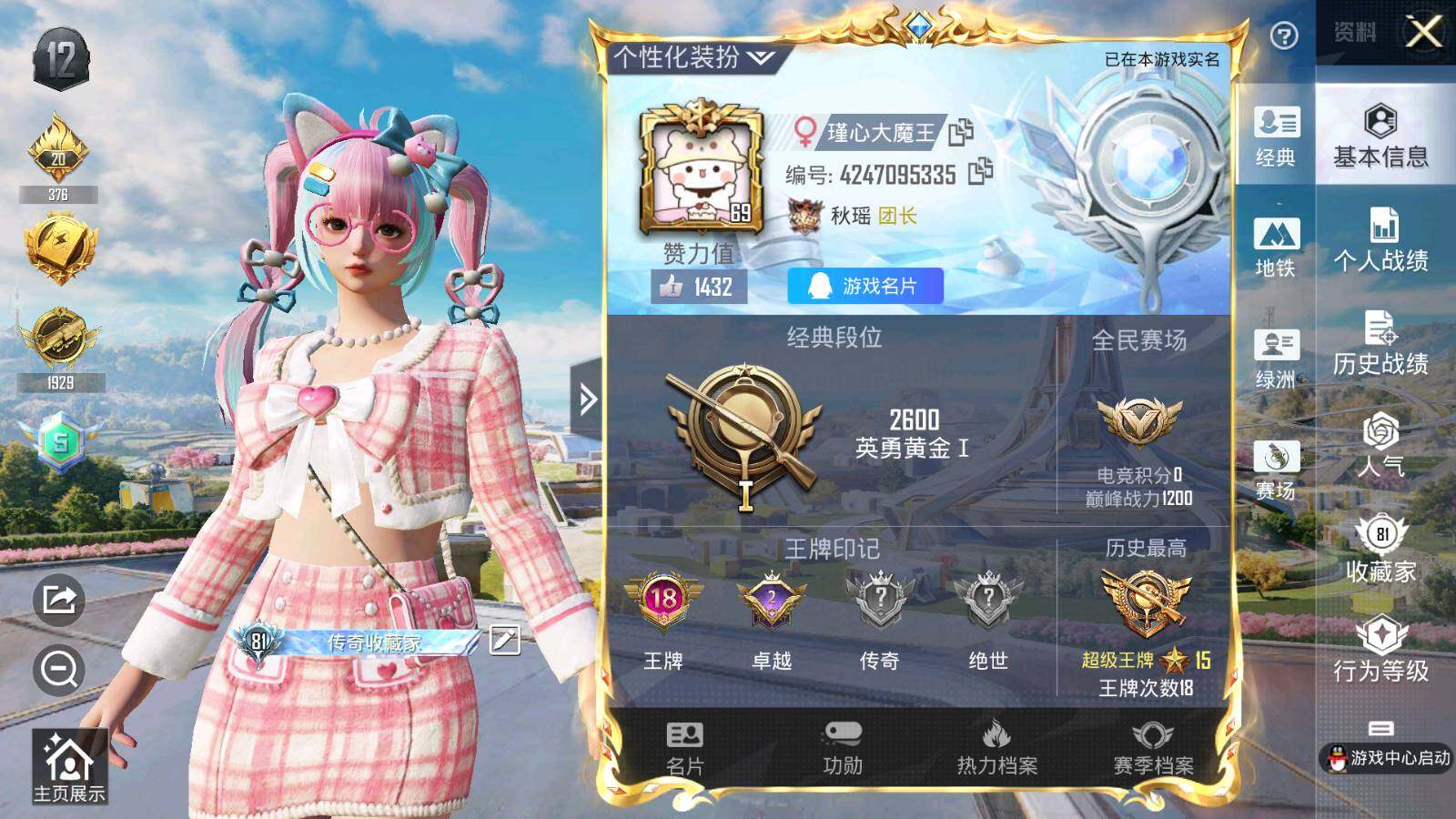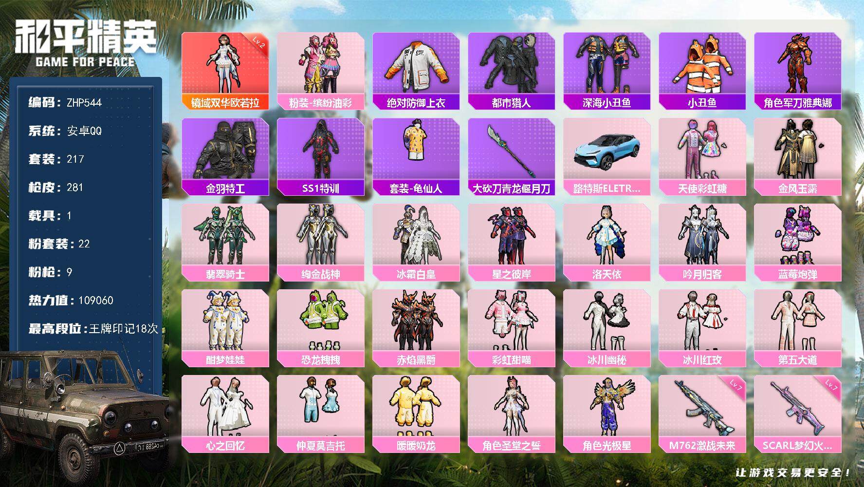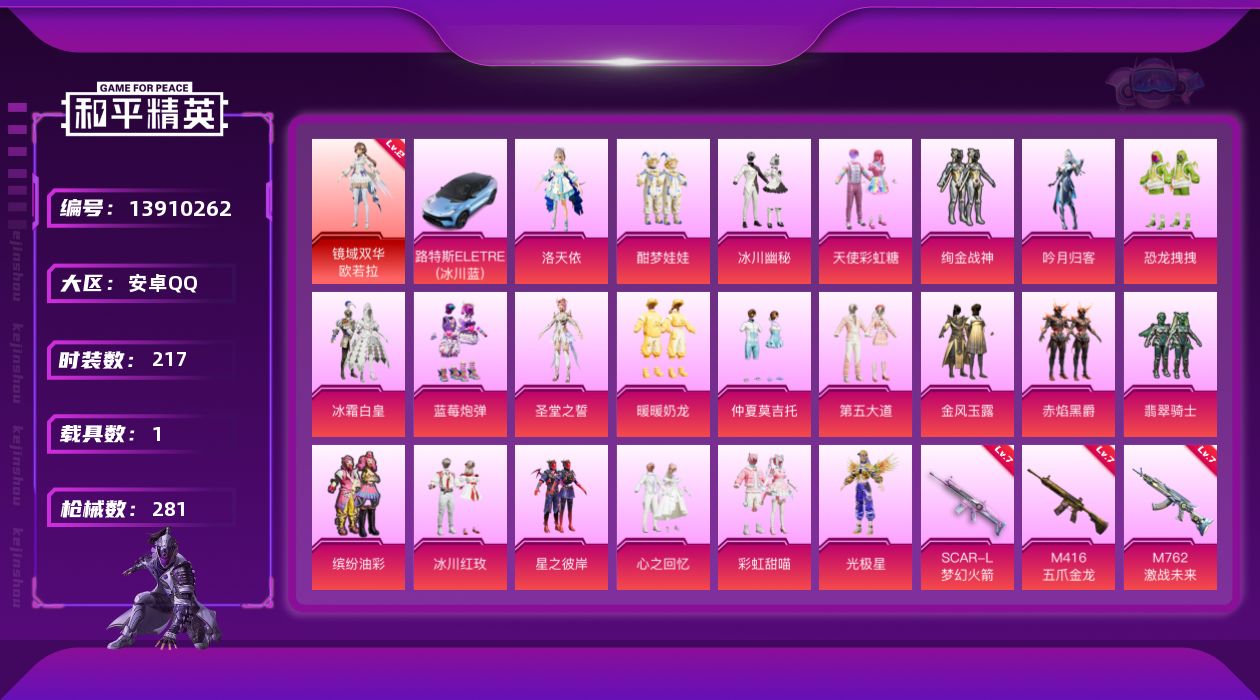 [13910262]满天赋-安卓 手Q-1神装-22粉装-9特效枪-1载具-8粉色飞行器-109060热力值-18王牌印记-217套装-281枪皮