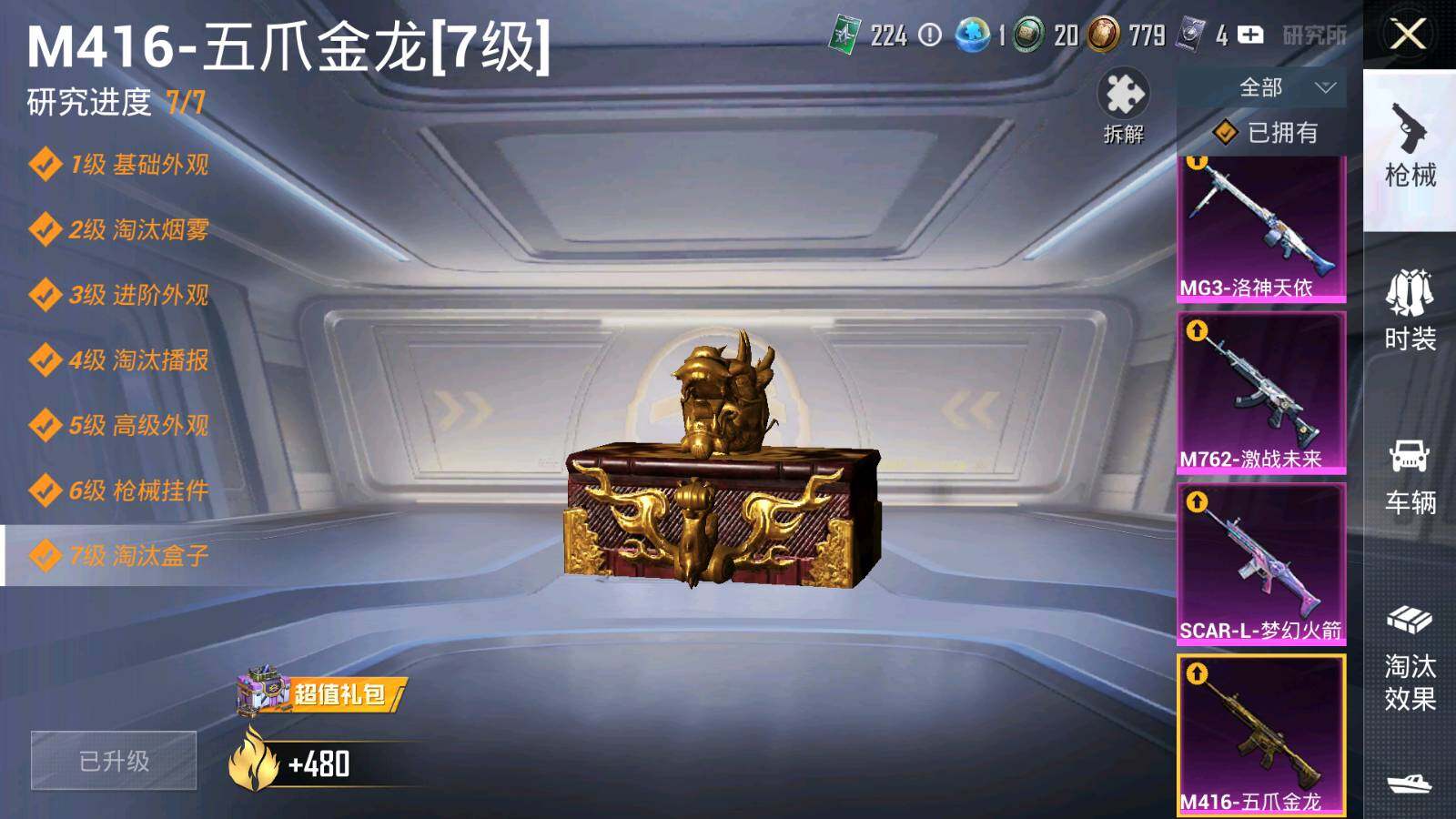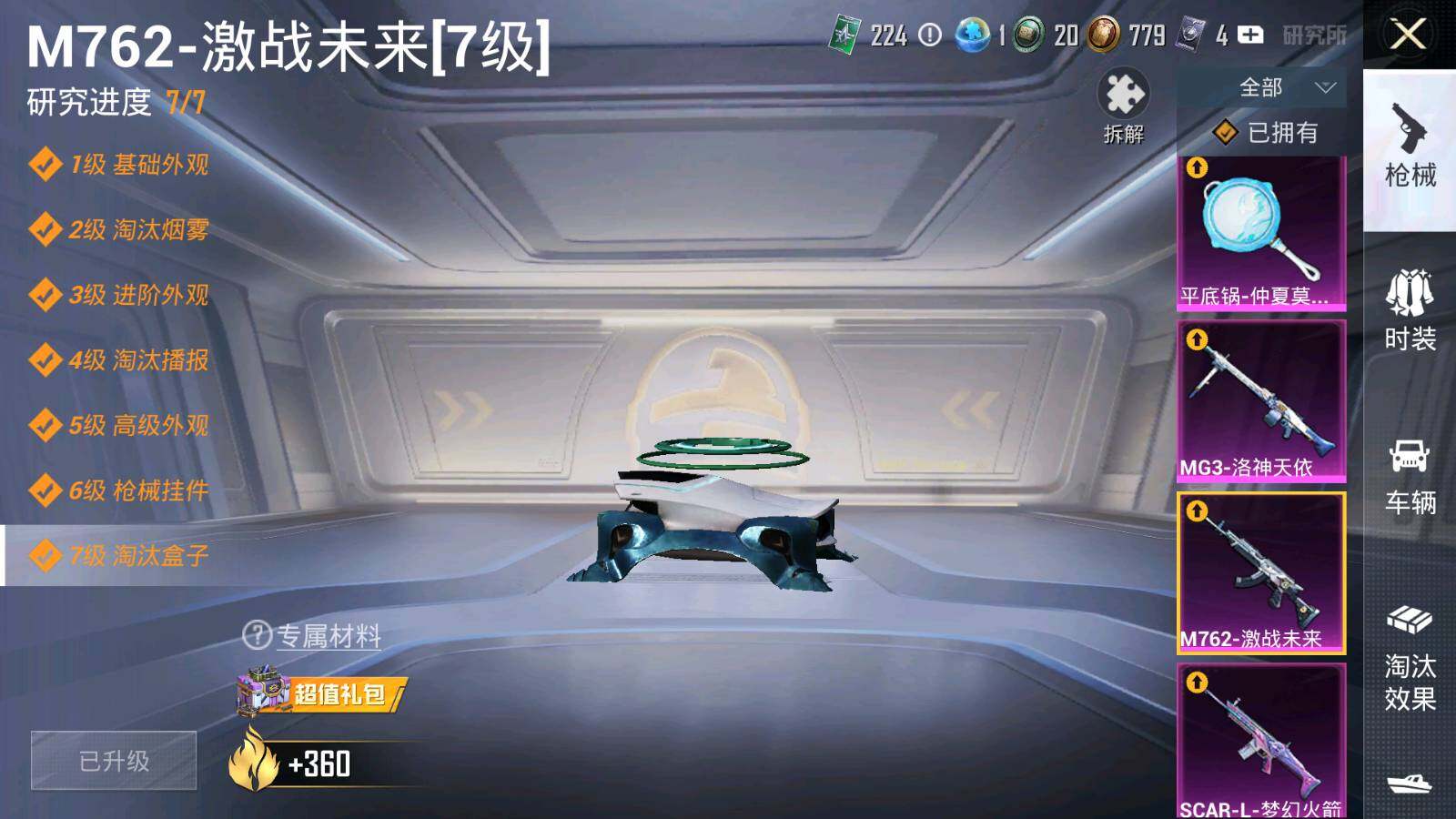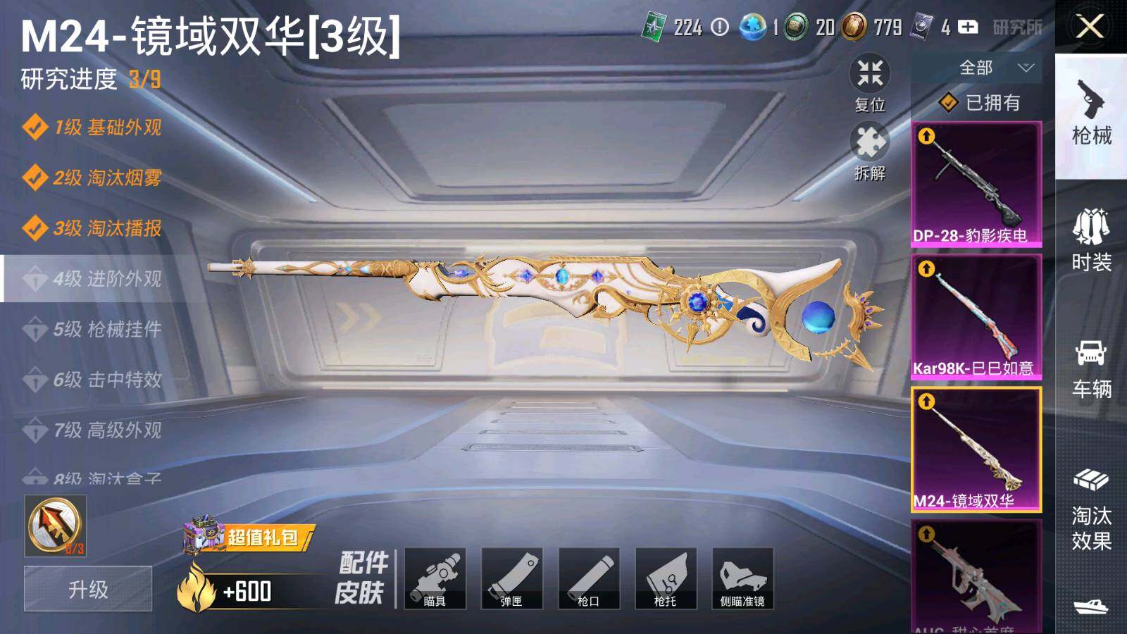 【粉色枪皮等级】:SCAR-L-梦幻火箭(七级),M416-五爪金龙(七级),AUG-甜心首席(五级),M762-激战未来(七级),Kar98K-巳巳如意(五级),M24-镜域双华(三级),DP-28-豹影疾电(一级),MG3-洛神天依(五级),平底锅-仲夏莫吉托(五级)