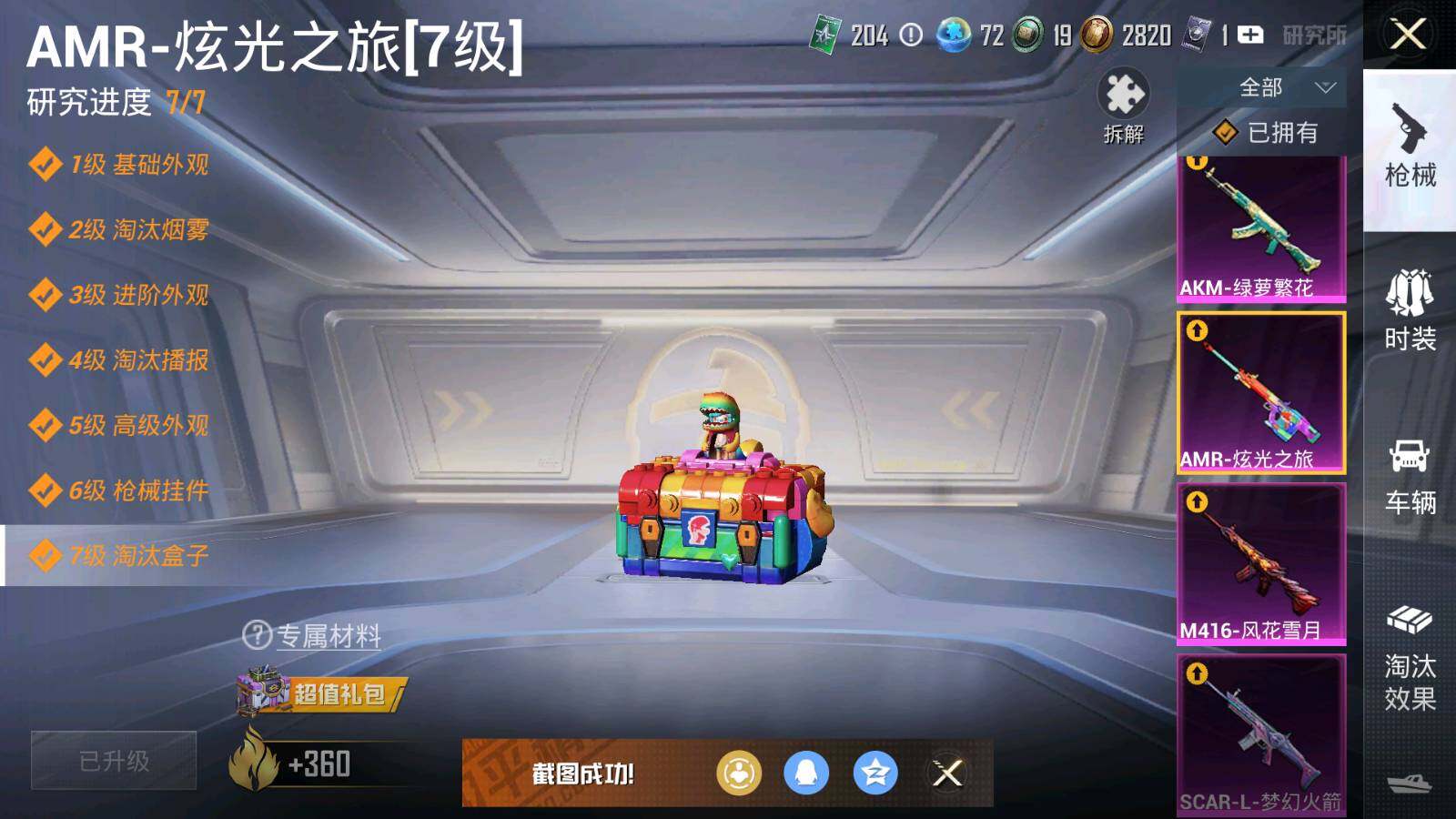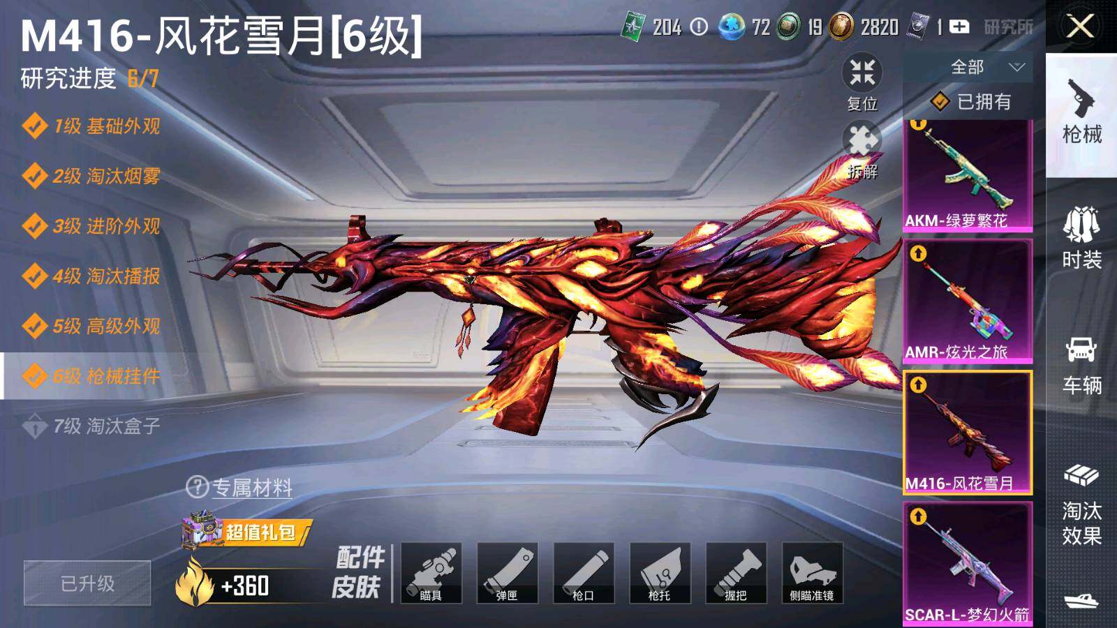 AKM-绿萝繁花,SCAR-L-梦幻火箭,M416-风花雪月,Kar98K-巳巳如意,AMR-炫光之旅