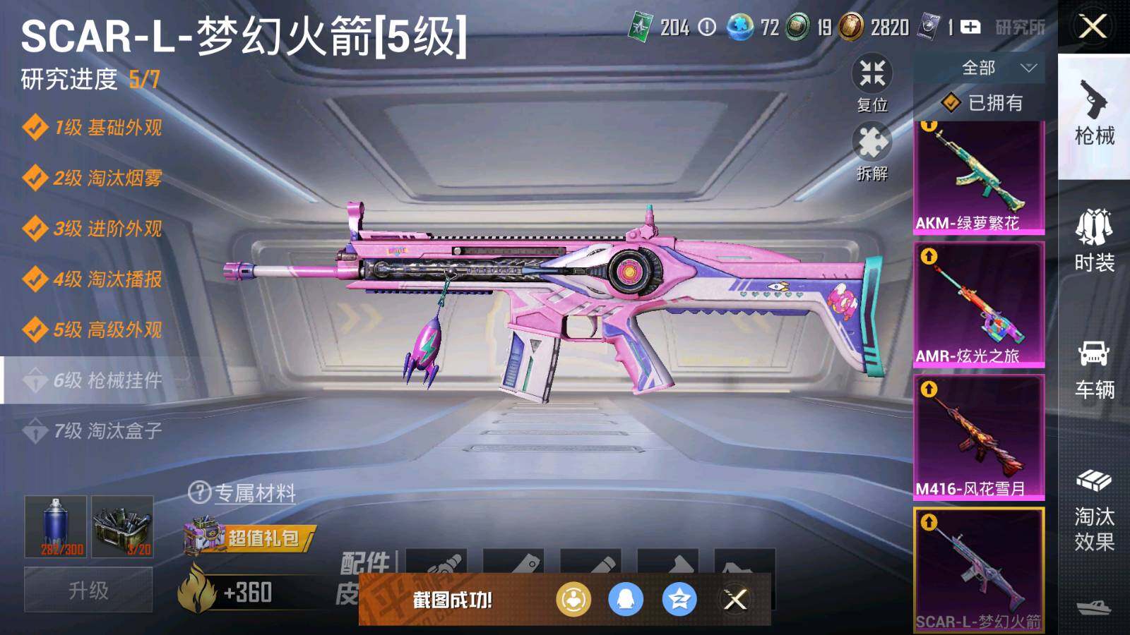 【粉色枪皮等级】:AKM-绿萝繁花(五级),SCAR-L-梦幻火箭(五级),SCAR-L-锦绣绵绵(五级),M416-风花雪月(六级),Kar98K-巳巳如意(五级),AMR-炫光之旅(七级),DP-28-豹影疾电(五级)
