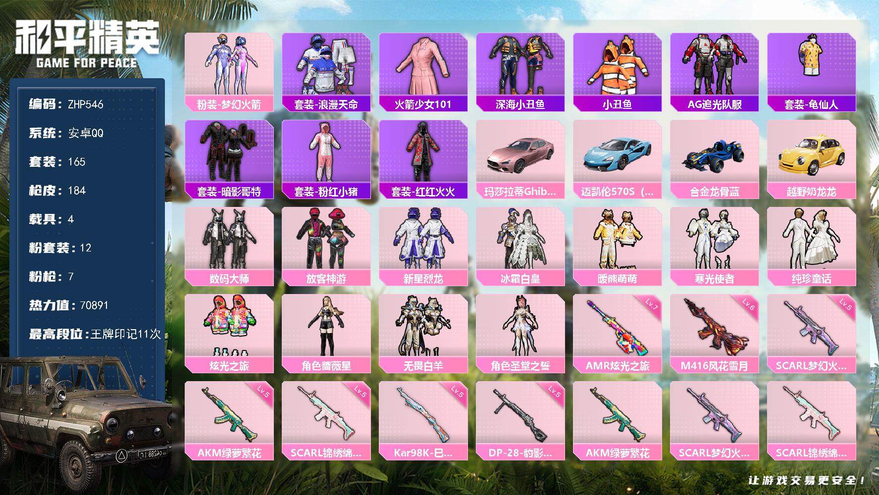 [13910291]安卓 手Q-老101-12粉装-7特效枪-4载具-3粉色飞行器-70891热力值-11王牌印记-165套装-184枪皮 【热门品类】:粉装-梦幻火箭,套装-浪漫天命,套装-火箭少女101,套装-深海小丑鱼,套装-小丑鱼,套装-AG追光队服,套装-龟仙人,套装-暗影哥特,套装-粉红小猪,套装-红红火火 【粉色载具】:玛莎拉蒂Ghibli(粉),迈凯伦570S(天际蓝),合金龙骨(蓝),越野奶龙龙 【粉色套装】:粉装-数码大师,粉装-梦幻火箭,粉装-放客神游,粉装-新星烈龙,粉装-冰霜白皇,粉装-暖熊萌萌,粉装-寒光使者,粉装-纯珍童话,粉装-炫光之旅,角色-蔷薇星,粉装-无畏白羊,角色-圣堂之誓 【粉色枪皮等级】:AKM-绿萝繁花(五级),SCAR-L-梦幻火箭(五级),SCAR-L-锦绣绵绵(五级),M416-风花雪月(六级),Kar98K-巳巳如意(五级),AMR-炫光之旅(七级),DP-28-豹影疾电(五级) 【粉色枪皮】:AKM-绿萝繁花,SCAR-L-梦幻火箭,SCAR-L-锦绣绵绵,M416-风花雪月,Kar98K-巳巳如意,AMR-炫光之旅,DP-28-豹影疾电 【粉色飞行器】:梦幻舞会飞行器,萌物绒绒飞行器,镜光幻境飞行翼 【粉色降落伞】:梦幻火箭降落伞,甜蜜誓约降落伞,橘柚倾心降落伞,暖熊萌萌降落伞,彩虹甜喵降落伞,音爆索尼克降落伞,仲夏莫吉托降落伞,炎氏战神降落伞,闲梦青缨降落伞,炫光之旅降落伞,圣堂之誓降落伞,月影灵韵降落伞 【稀有套装】:套装-龟仙人,套装-巳巳如意,角色-狂花道·娜可露露,套装-星渊小夜曲 【稀有枪皮】:AKM-夜灯,AKM-彩虹符号,AKM-影袭,AKM-生命誓言,AKM-破晓战魂,AKM-缤纷海域,AKM-虎虎生威,AKM-霓虹街区,AKM-龙的传人,M16A4-莲影清波,M16A4-蓝色火焰,SCAR-L-夜灯,SCAR-L-炫彩节奏,SCAR-L-玉兔迎春,SCAR-L-甜蜜誓约,SCAR-L-红色方程式,SCAR-L-银碳小老虎,M416-糯团青竹,M416-红色方程式,M416-绯红前夜,M416-蓝色火焰,GROZA-2B战斗服款,GROZA-影袭,GROZA-恐龙拽拽,GROZA-懵萌河马,GROZA-田园牧歌,AUG-天降萌叽,AUG-耀粉歌者,AUG-闲梦青缨,AUG-月影灵韵,QBZ-彩虹符号,QBZ-