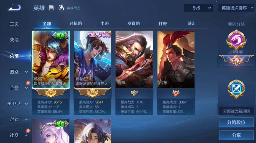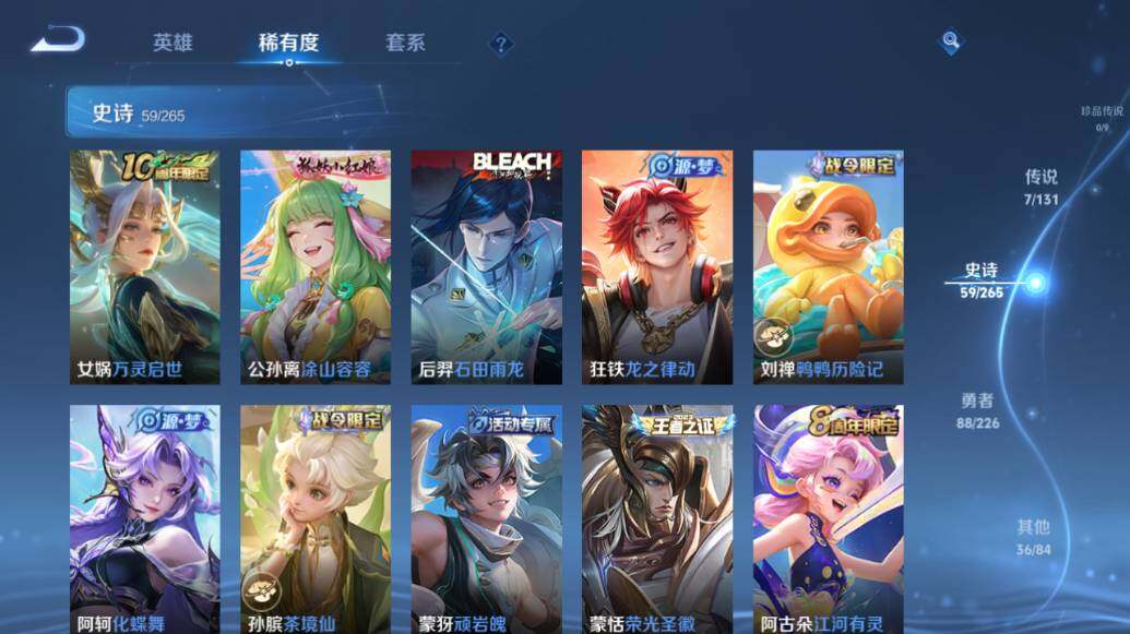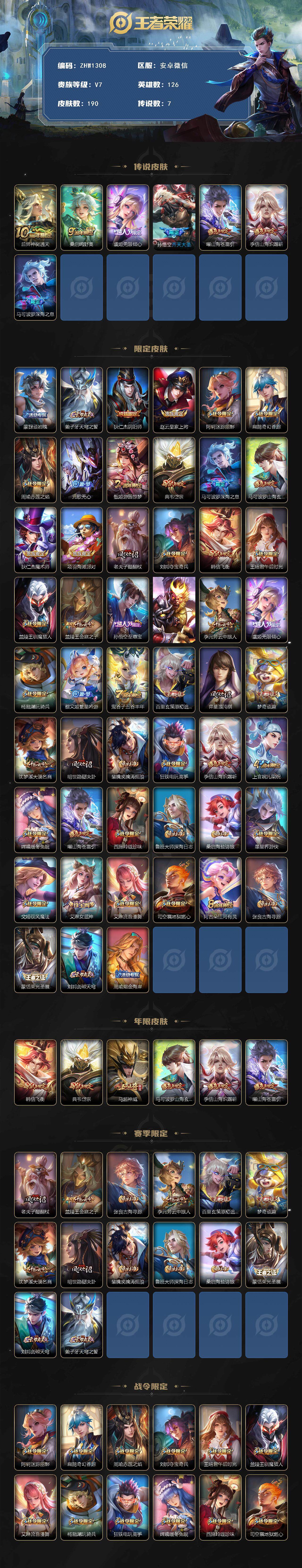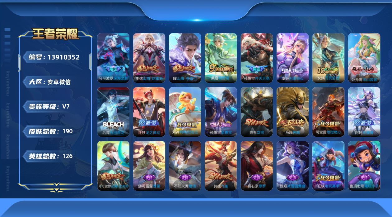 [13910352]安卓WX-V7-最强王者段位-126英雄-190皮肤-0典藏-0珍品无双-0无双-0珍品传说-7传说-59史诗