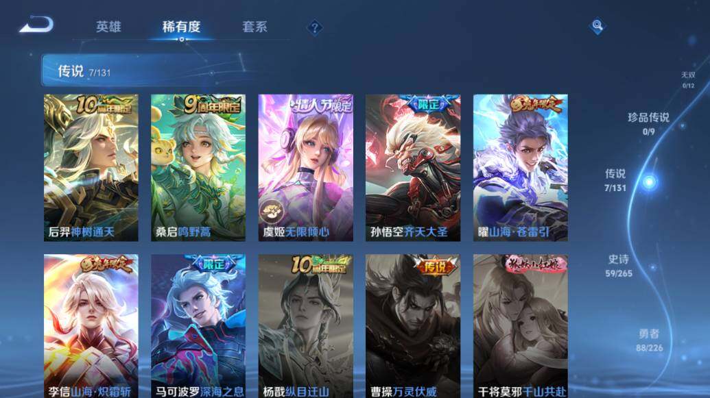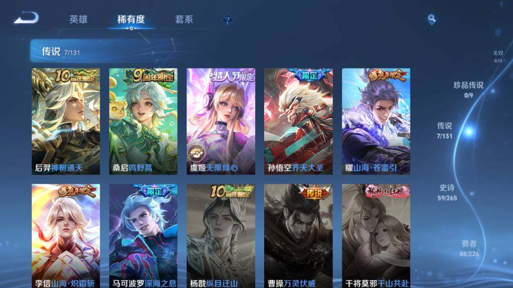【传说皮肤】:后羿神树通天,桑启鸣野蒿,虞姬无限倾心,孙悟空齐天大圣,曜山海苍雷引,李信山海炽霜斩,马可波罗深海之息
