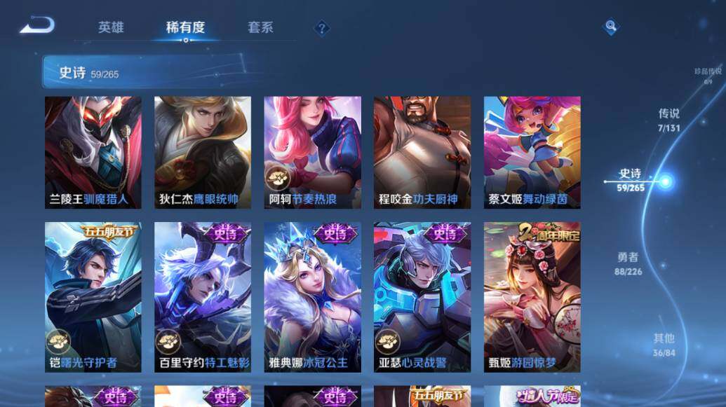 【史诗皮肤】:鲁班七号电玩小子,赵云皇家上将,貂蝉圣诞恋歌,甄姬冰雪圆舞曲,狄仁杰魔术师,宫本武藏鬼剑武藏,孙尚香水果甜心,嬴政摇滚巨星,妲己魅力维加斯,妲己女仆咖啡,墨子金属风暴,李白千年之狐,吕布末日机甲,张飞乱世虎臣,孙悟空至尊宝,花木兰水晶猎龙者,刘邦德古拉伯爵,小乔缤纷独角兽,诸葛亮黄金分割率,甄姬游园惊梦,亚瑟心灵战警,雅典娜冰冠公主,百里守约特工魅影,铠曙光守护者,蔡文姬舞动绿茵,程咬金功夫厨神,阿轲节奏热浪,狄仁杰鹰眼统帅,兰陵王驯魔猎人,上官婉儿梁祝