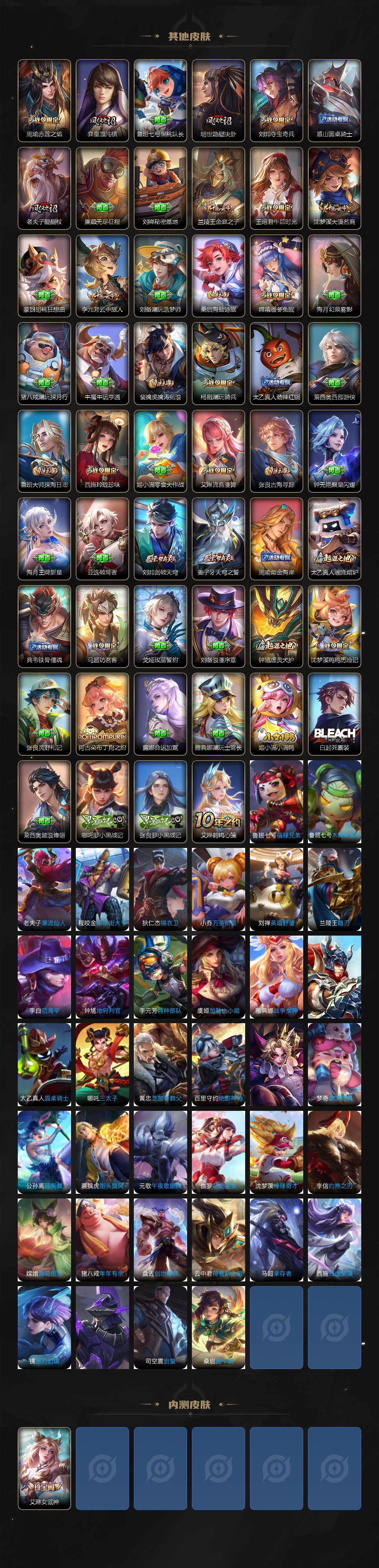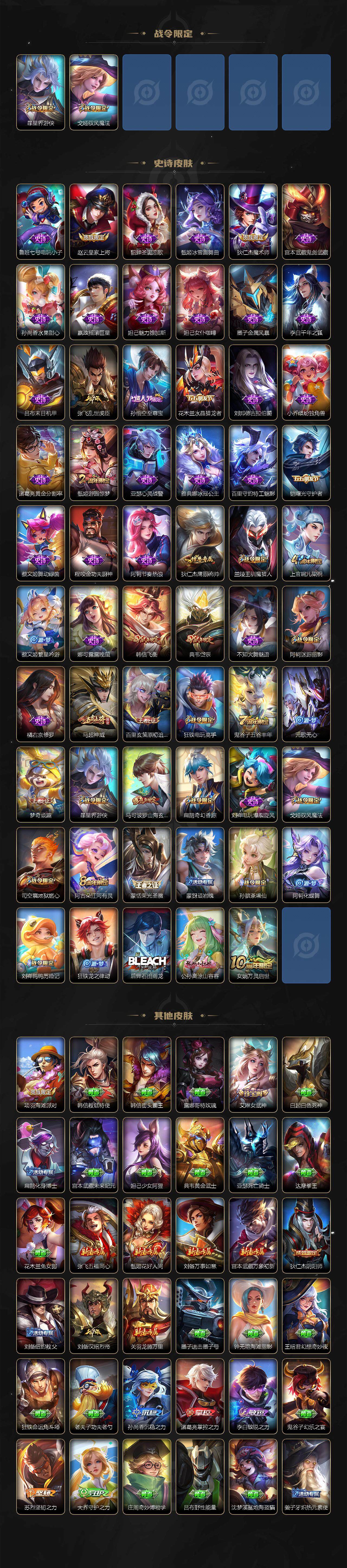 【限定皮肤】:蒙犽顽岩魄,姜子牙天穹之誓,狄仁杰阴阳师,赵云皇家上将,阿轲迷踪丽影,扁鹊奇幻香踪,周瑜赤莲之焰,元歌无心,甄姬游园惊梦,典韦岱宗,马可波罗深海之息,马可波罗山海玄木吟,狄仁杰魔术师,项羽海滩派对,老夫子醍醐杖,刘邦夺宝奇兵,韩信飞衡,王昭君午后时光,兰陵王驯魔猎人,兰陵王金庭之子,孙悟空至尊宝,孙悟空齐天大圣,李元芳云中旅人,虞姬无限倾心,杨戬潮玩骑兵,蔡文姬繁星吟游,鬼谷子五谷丰年,百里玄策原初追逐者,弈星混沌棋,梦奇顽趣,沈梦溪大漠名商,明世隐疑决卦,裴擒虎擒涛扼浪,狂铁电玩高手,李信山海炽霜斩,上官婉儿梁祝,嫦娥暖冬兔眠,曜山海苍雷引,西施玲珑珍味,鲁班大师探海日志,桑启海盐诗旅,暃星界游侠,戈娅驭风魔法,艾琳女武神,艾琳流音漫舞,司空震地狱燃心,阿古朵江河有灵,张良古海寻踪,蒙恬荣光圣徽,刘邦剑破天穹,周瑜熔金海岸