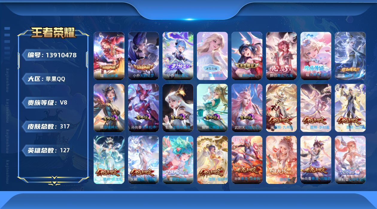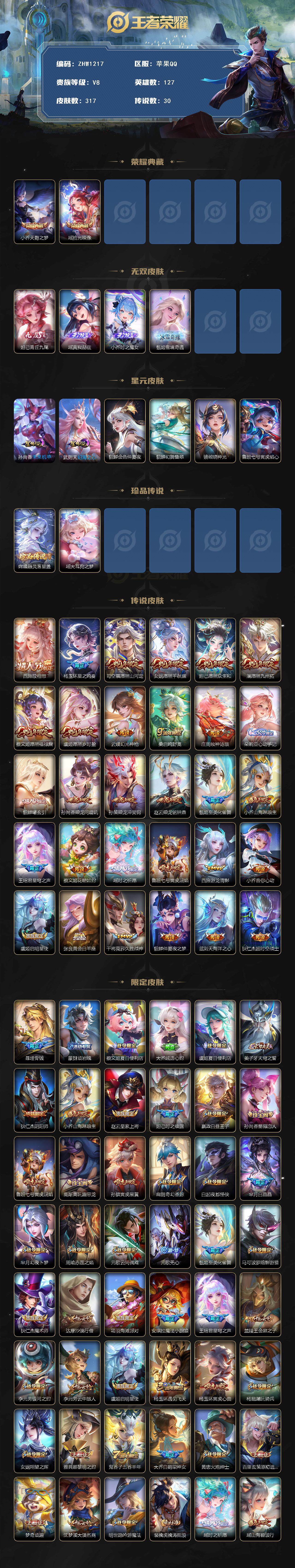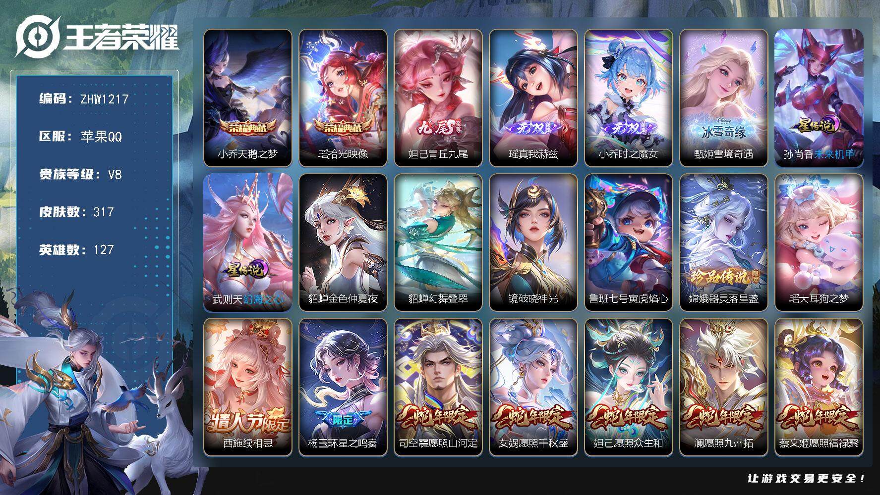 [13910478]苹果Q-V8-至尊星耀I段位-127英雄-317皮肤-2典藏-4无双-2珍品传说-6星传说-30传说-99史诗