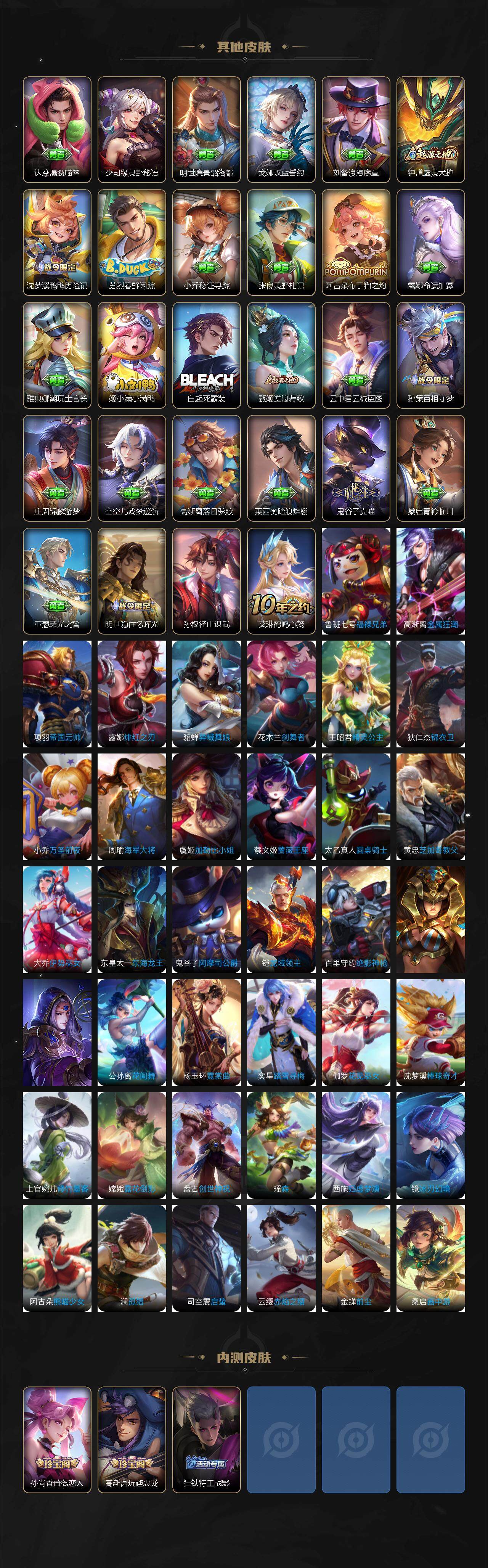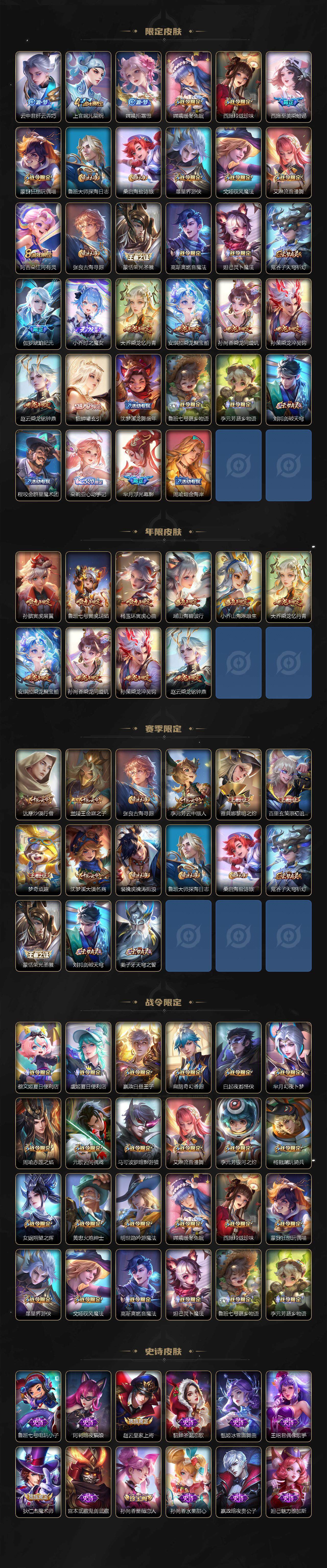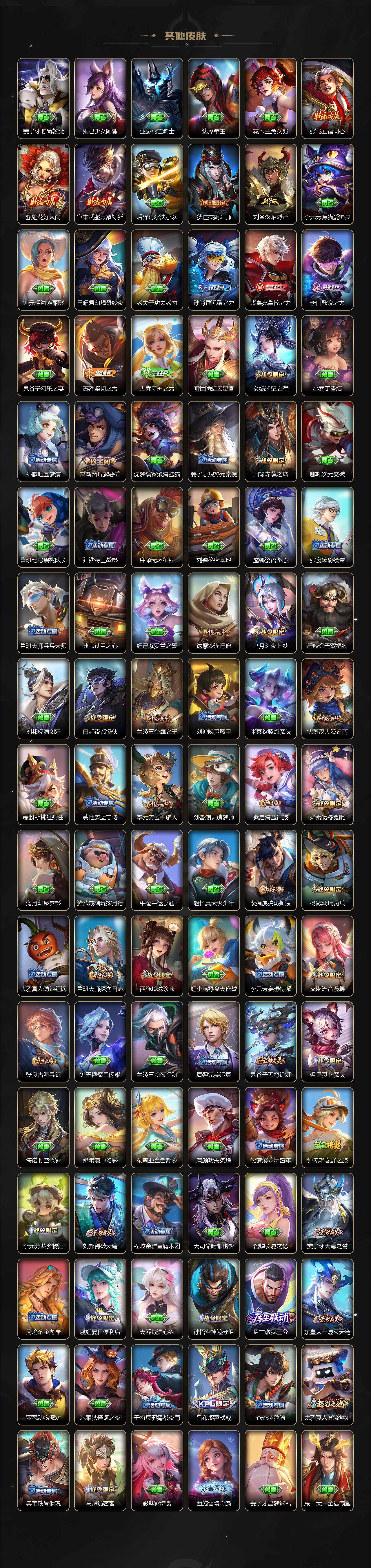 【限定皮肤】:暃埋骨钱,蒙犽顽岩魄,蔡文姬夏日便利店,大乔绒语心约,虞姬夏日便利店,姜子牙天穹之誓,狄仁杰阴阳师,小乔山海琳琅生,赵云皇家上将,妲己时之彼端,嬴政白昼王子,孙尚香蔷薇恋人,鲁班七号寅虎瑞焰,高渐离玩趣恶龙,孙膑寅虎展翼,扁鹊奇幻香踪,白起夜都怪侠,芈月白晶晶,芈月幻夜卜梦,周瑜赤莲之焰,元歌云间偶戏,元歌无心,甄姬至美化雀舞,马可波罗暗影游猎,狄仁杰魔术师,达摩沙漠行僧,项羽海滩派对,安琪拉魔法小厨娘,王昭君星穹之声,兰陵王金庭之子,李元芳银河之约,李元芳云中旅人,虞姬启明星使,杨玉环遇见飞天,杨玉环寅虎心曲,杨戬潮玩骑兵,女娲朔望之晖,雅典娜黎明之约,鬼谷子五谷丰年,大乔白鹤梁神女,黄忠火炮绅士,百里玄策原初追逐者,梦奇顽趣,沈梦溪大漠名商,明世隐吟游魔法,裴擒虎擒涛扼浪,瑶时之祈愿,瑶山海碧波行,云中君纤云弄巧,上官婉儿梁祝,嫦娥拒霜思,嫦娥暖冬兔眠,西施玲珑珍味,西施至美乘鲤谣,蒙犽狂想玩偶喵,鲁班大师探海日志,桑启海盐诗旅,暃星界游侠,戈娅驭风魔法,艾琳流音漫舞,阿古朵江河有灵,张良古海寻踪,蒙恬荣光圣徽,高渐离燃音魔法,妲己灵卜魔法,鬼谷子天穹祈灯,伽罗琥珀纪元,小乔时之魔女,大乔乘龙忆丹青,安琪拉乘龙聚宝船,孙尚香乘龙问璇玑,孙策乘龙淬吴钩,赵云乘龙铭钟鼎,貂蝉曦玄引,沈梦溪龙舞盛年,鲁班七号蔬乡物语,李元芳蔬乡