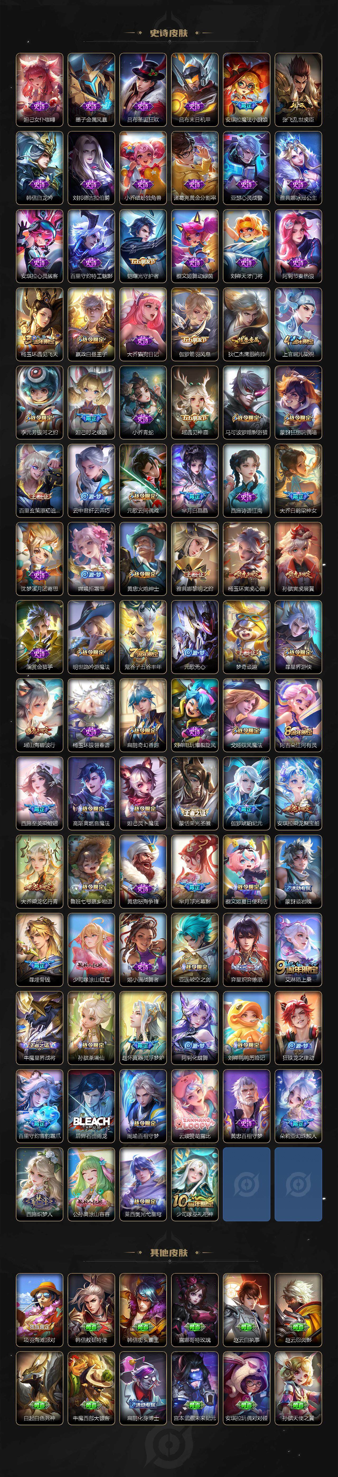 - [12198579]V8 2典藏 2无双 2珍品传说 40传说 124英雄 302皮肤 可修改实名 优质装备:幻阙歌(貂蝉典藏),真我赫兹(瑶)(瑶无双),花合斗,拾光映像(瑶典藏),怪盗基德,大耳狗之梦,黄金射手座,久胜战神,炽阳神光,末日机甲-孙尚香(绿蚂蚱),仲夏夜之梦(大飞蛾),游龙清影(小青龙),山海·琳琅生(小乔年限),炽翼辉光(娃娃菜牛角包),大乔-时之奇旅,永恒水手月亮,夜礼服假面,霜月吟,澜逐花归海,金乌负日,朵莉亚心动手记,牧神诗旅,涂山容容 传说皮:乘龙·问璇玑(孙尚香年限),乘龙·铭钟鼎(赵云年限),乘龙·淬吴钩(孙策年限),貂蝉曦玄引,云诺千山,续相思,星之鸣奏,幻光神枪 珍宝阁皮:女武神 限定皮:愿照·九州拓(澜年限),愿照·福禄聚(蔡文姬年限),愿照·岁时盈(虞姬年限),愿照·山河定(司空震年限),愿照·众生和(妲己年限),愿照·千秋盛(女娲年限),逐霄战戟,映山客,陌上桑,鸣野蒿,凤凰于飞,太华(伽罗年限),补天,前尘镜,绯月行,时之彼端,时雨天司(水龙头),山海·碧波行(瑶年限),至美·乘鲤谣,无限倾心-虞姬,五谷丰年,梁祝,祈雪灵祝(雪兔子),引擎之心,寅虎·心曲(虎婆),玉兔公主 史诗皮:鸭鸭历险记-刘禅,器灵·浮梦炉,化蝶舞,星界战将,谪仙醉月,龙之律动,石田雨龙,百相守梦-周瑜,茶境仙,幻珠鲛人,怒海争锋,撼地雄心,破空之剑,战舞者,涂山红红,东方月初,蒙犽顽岩魄,芈月浮光幕影,海诺心动手记,琥珀纪元伽罗,上官婉儿群星魔术团,蔬乡物语(鲁班七号),乘龙·聚宝船(安琪拉年限),乘龙·忆丹青(大乔年限),百相守梦-百里守约,百相守梦-黄忠,织梦人,守夜人,遇见神鹿,紫霞仙子,特工魅影,永昼,江河有灵,魅语,百解令(蒙犽),高渐离燃音魔法,冰冠公主,青蛇,偶像歌手,电玩·兔顽号,银翎春语,末日机甲-吕布,猫狗日记-孙策,猫狗日记-大乔,乱世虎臣,节奏热浪,女仆咖啡,摇滚巨星,水果甜心,天才门将,星夜王子,心灵骇客,功夫厨神,暗隐猎兽者,幽灵船长,鬼剑武藏,心灵战警,地狱岩魂,诗语江南,纤云弄巧,拒霜思,缤纷独角兽,水晶猎龙者,曙光守护者,圣诞狂欢,圣诞恋歌,鹰眼统帅,暗夜贵公子,魅力维加斯,未来纪元-赵云