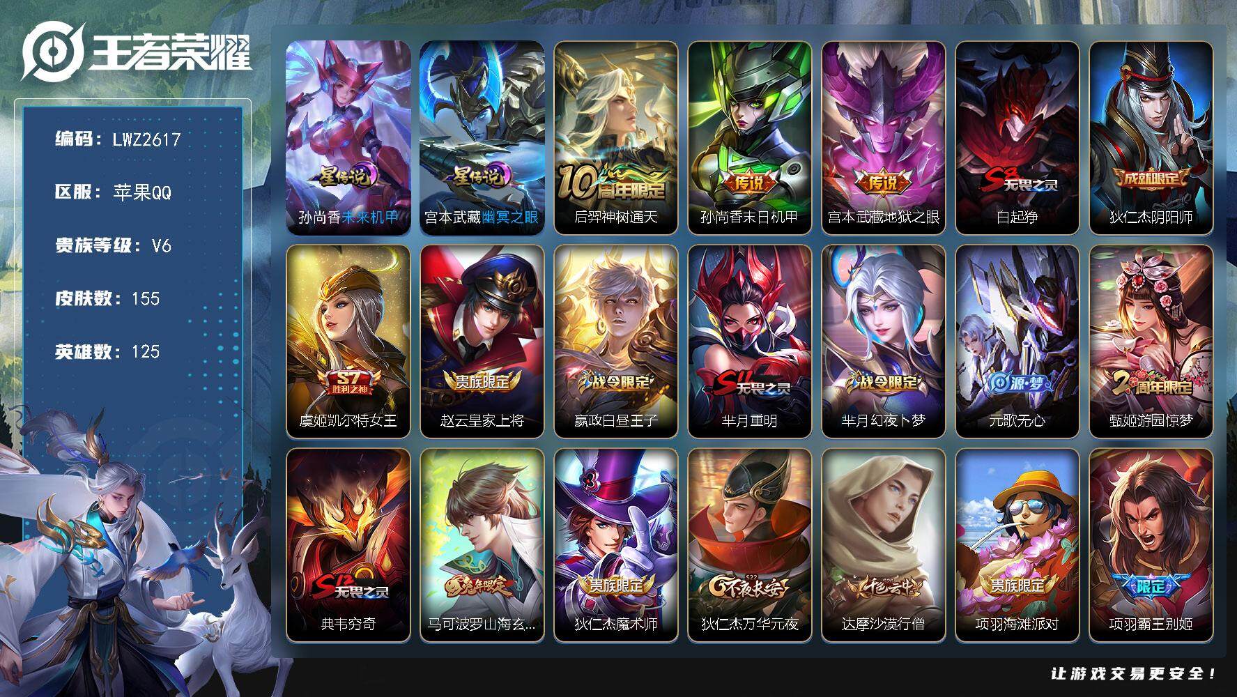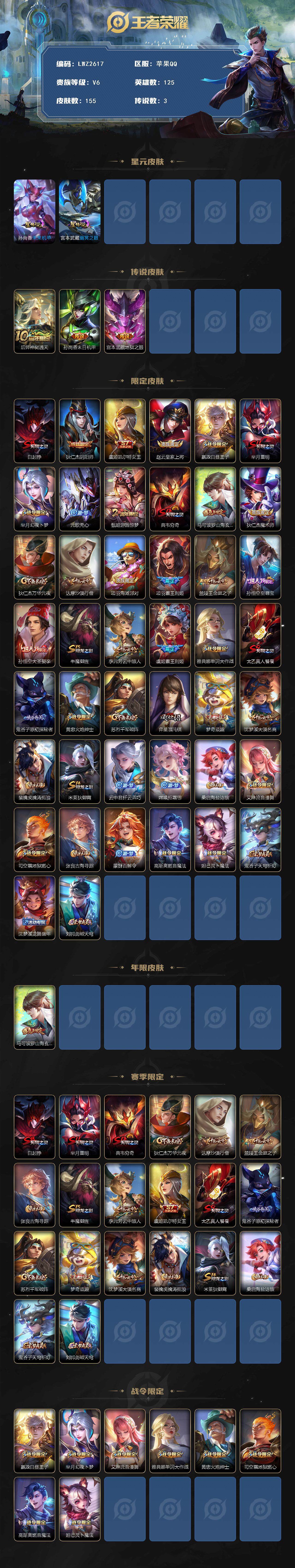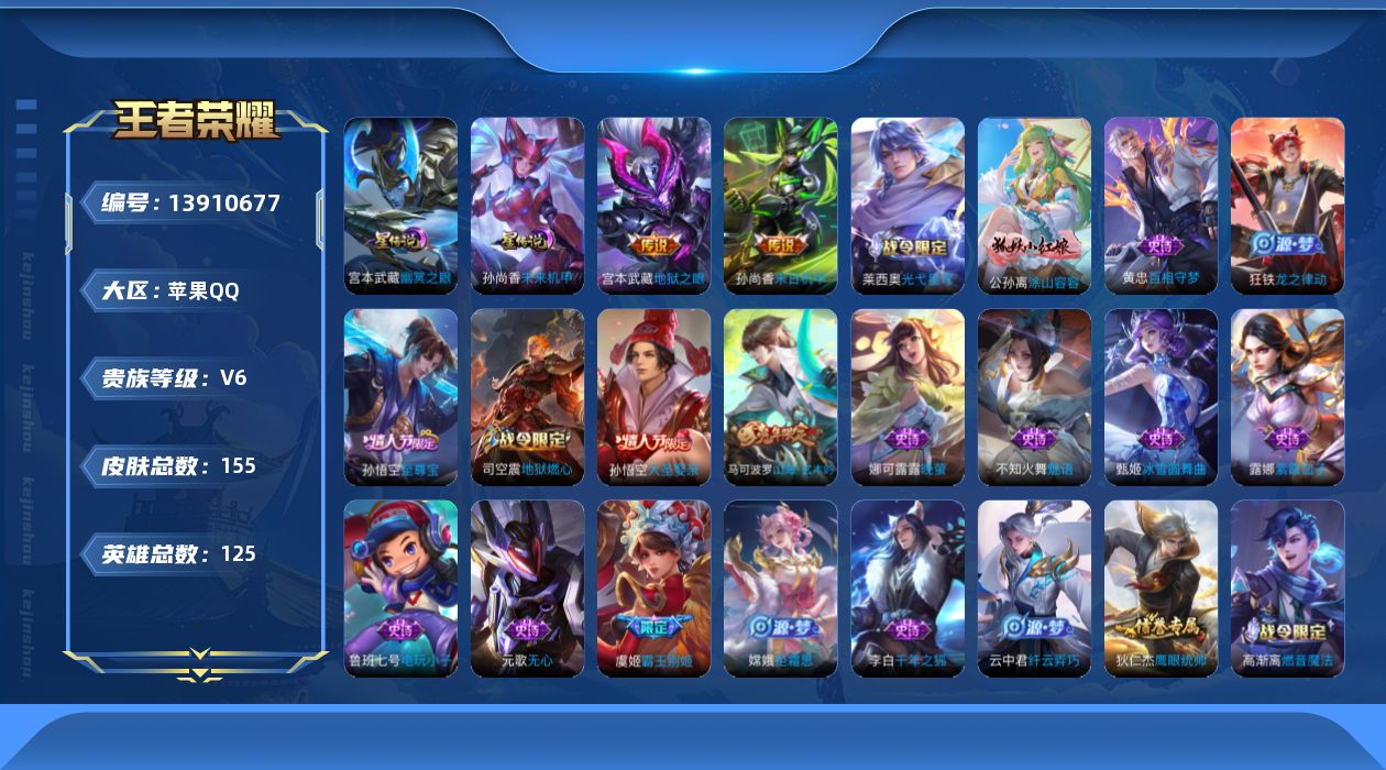 [13910677]不可二次 苹果Q-V6-最强王者段位-125英雄-155皮肤-2星传-3传说-43史诗