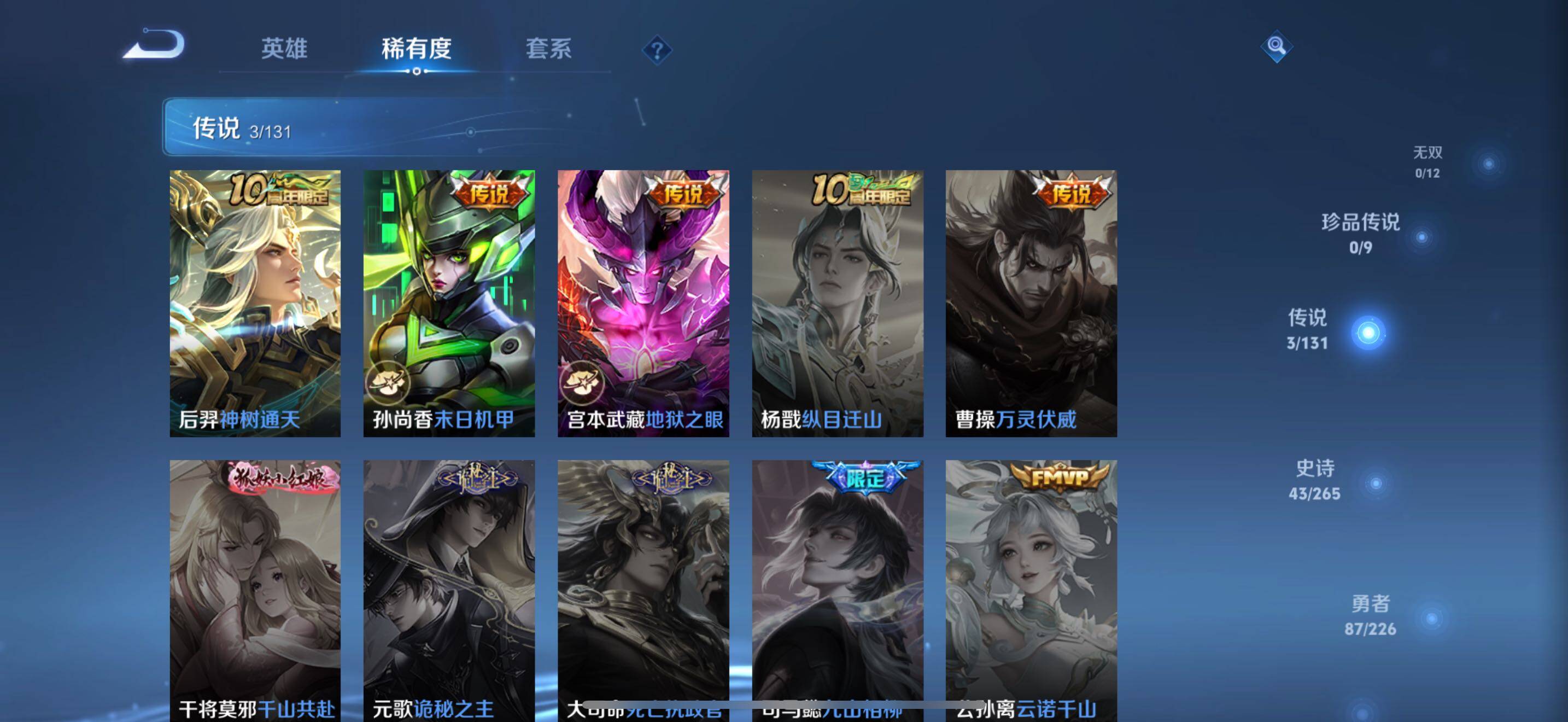 【赛季限定】:白起狰,芈月重明,典韦穷奇,狄仁杰万华元夜,达摩沙漠行僧,兰陵王金庭之子,张良古海寻踪,牛魔御旌,李元芳云中旅人,虞姬凯尔特女王,太乙真人饕餮,鬼谷子原初探秘者,苏烈千军破阵,弈星混沌棋,梦奇顽趣,沈梦溪大漠名商,裴擒虎擒涛扼浪,米莱狄御霄,桑启海盐诗旅,鬼谷子天穹祈灯,刘邦剑破天穹