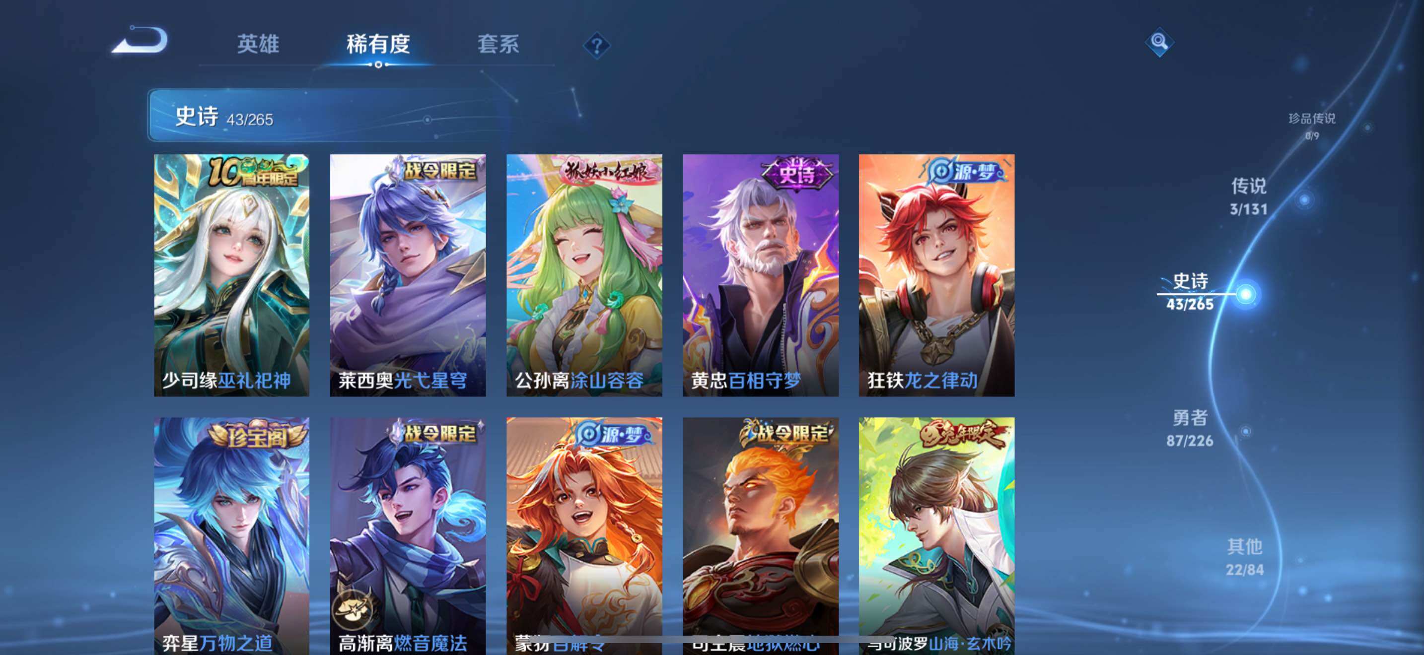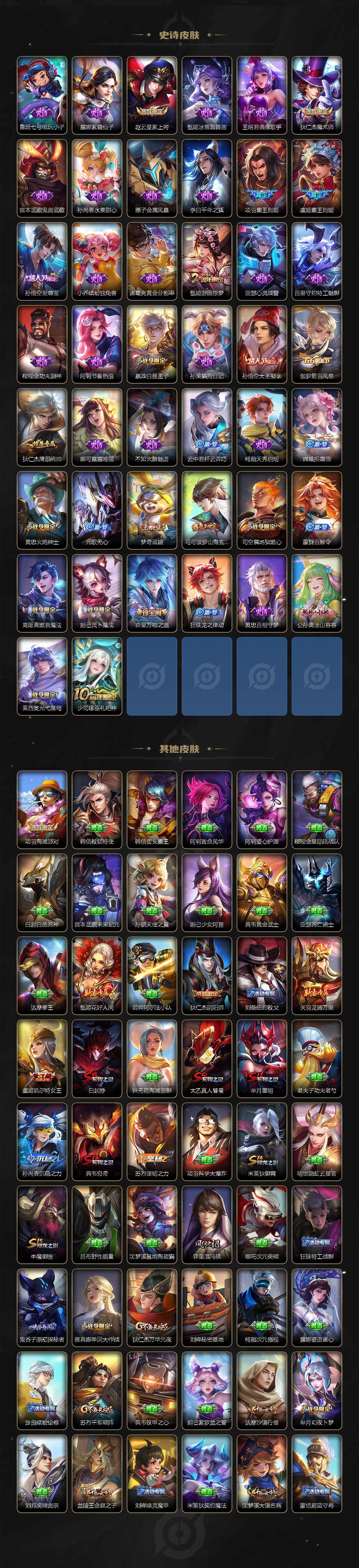 【史诗皮肤】:鲁班七号电玩小子,露娜紫霞仙子,赵云皇家上将,甄姬冰雪圆舞曲,王昭君偶像歌手,狄仁杰魔术师,宫本武藏鬼剑武藏,孙尚香水果甜心,墨子金属风暴,李白千年之狐,项羽霸王别姬,虞姬霸王别姬,孙悟空至尊宝,小乔缤纷独角兽,诸葛亮黄金分割率,甄姬游园惊梦,亚瑟心灵战警,百里守约特工魅影,程咬金功夫厨神,阿轲节奏热浪,嬴政白昼王子,孙策猫狗日记,孙悟空大圣娶亲,伽罗箭羽风息,狄仁杰鹰眼统帅,娜可露露晚萤,不知火舞魅语,云中君纤云弄巧,杨戬天秀启明,嫦娥拒霜思,黄忠火炮绅士,元歌无心,梦奇顽趣,马可波罗山海玄木吟,司空震地狱燃心,蒙犽百解令,妲己灵卜魔法,高渐离燃音魔法,弈星万物之道,狂铁龙之律动,黄忠百相守梦,公孙离涂山容容,莱西奥光弋星穹,少司缘巫礼祀神