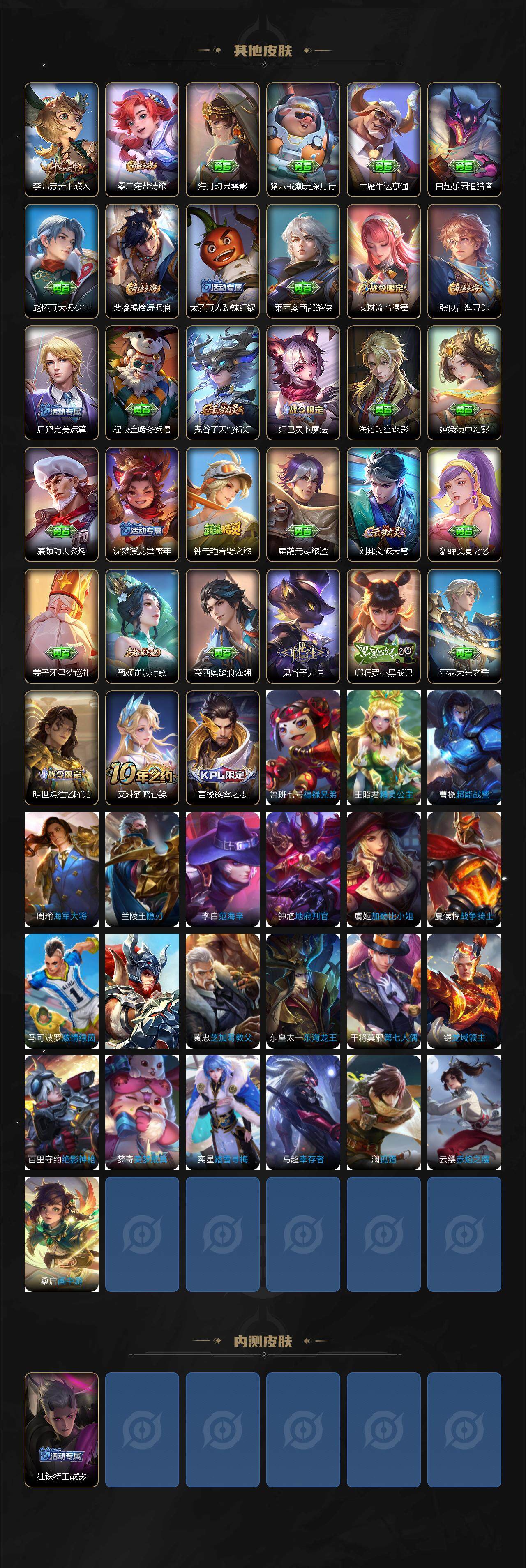 【限定皮肤】:白起狰,狄仁杰阴阳师,虞姬凯尔特女王,赵云皇家上将,嬴政白昼王子,芈月重明,芈月幻夜卜梦,元歌无心,甄姬游园惊梦,典韦穷奇,马可波罗山海玄木吟,狄仁杰魔术师,狄仁杰万华元夜,达摩沙漠行僧,项羽海滩派对,项羽霸王别姬,兰陵王金庭之子,孙悟空至尊宝,孙悟空大圣娶亲,牛魔御旌,李元芳云中旅人,虞姬霸王别姬,雅典娜单词大作战,太乙真人饕餮,鬼谷子原初探秘者,黄忠火炮绅士,苏烈千军破阵,弈星混沌棋,梦奇顽趣,沈梦溪大漠名商,裴擒虎擒涛扼浪,米莱狄御霄,云中君纤云弄巧,嫦娥拒霜思,桑启海盐诗旅,艾琳流音漫舞,司空震地狱燃心,张良古海寻踪,蒙犽百解令,高渐离燃音魔法,妲己灵卜魔法,鬼谷子天穹祈灯,沈梦溪龙舞盛年,刘邦剑破天穹