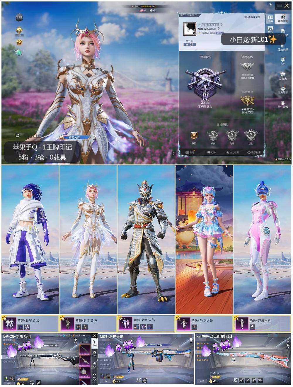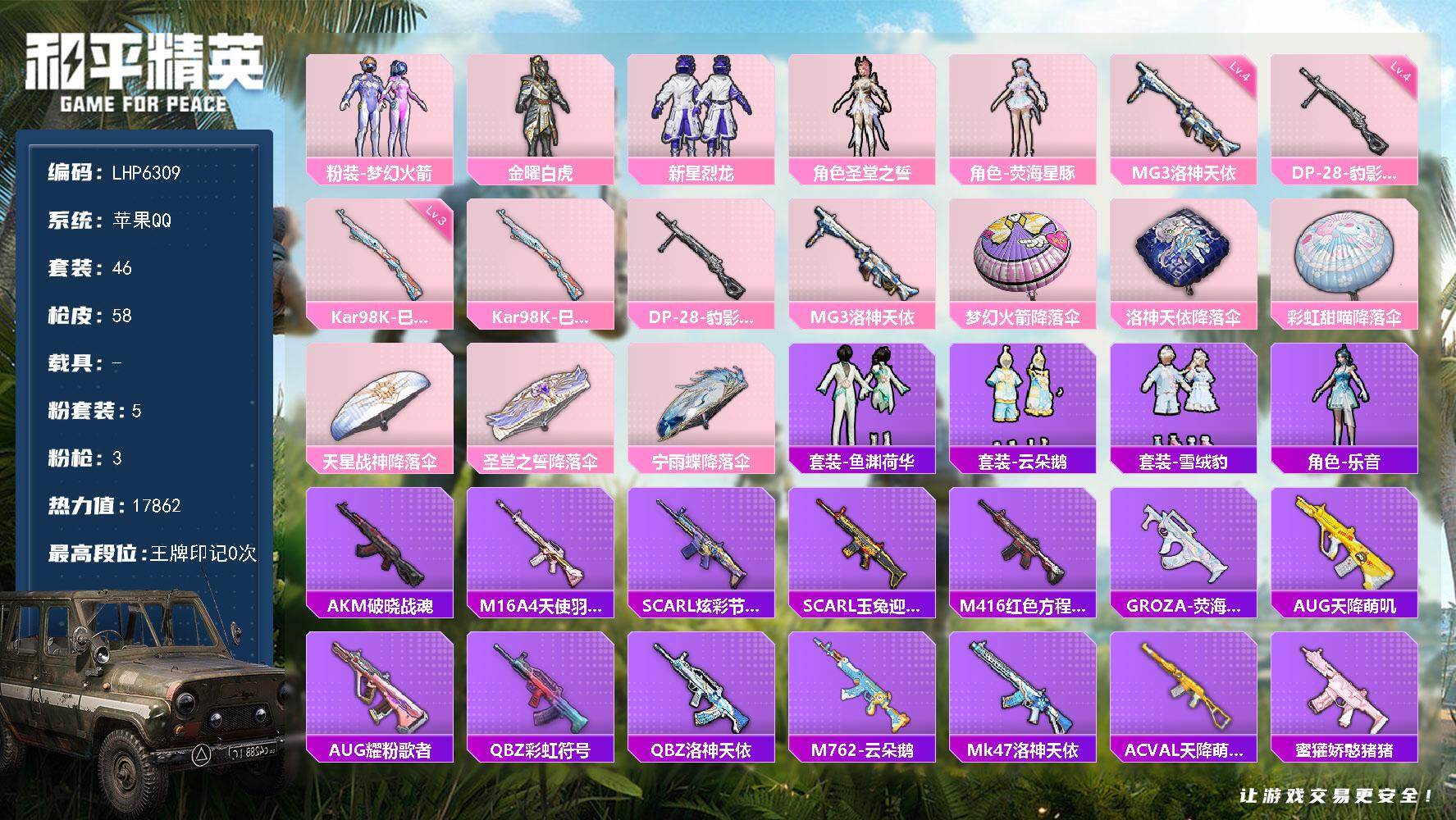[13910743]【店主推荐捡漏号!可直接换绑 】苹果 手Q-5粉装-3特效枪-1.7w热力值-1王牌印记-46套装-58枪皮【热门品类】:粉装-梦幻火箭【粉色套装】:粉装-金曜白虎,粉装-梦幻火箭,粉装-新星烈龙,角色-圣堂之誓,角色-荧海星豚【粉色枪皮等级】:Kar98K-巳巳如意(三级),DP-28-豹影疾电(四级),MG3-洛神天依(四级)