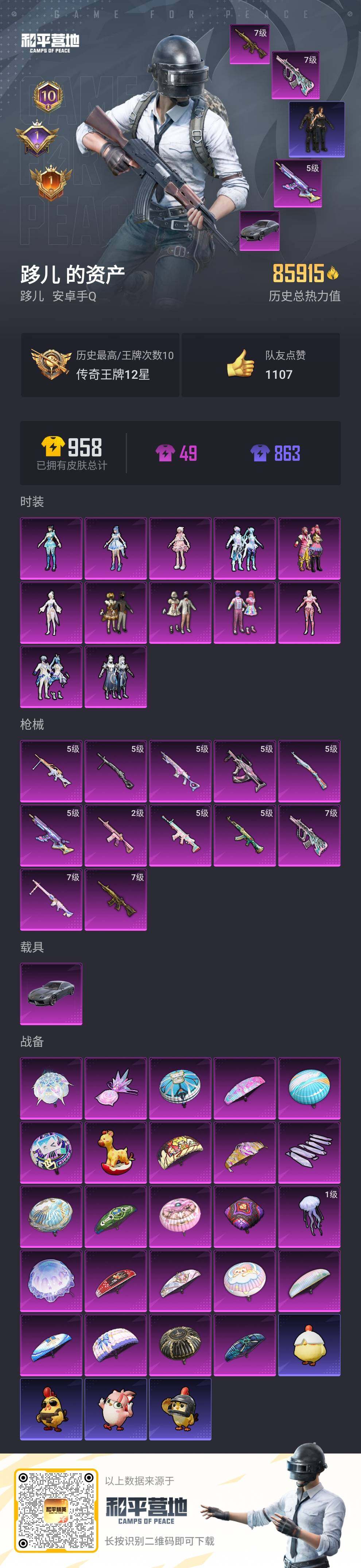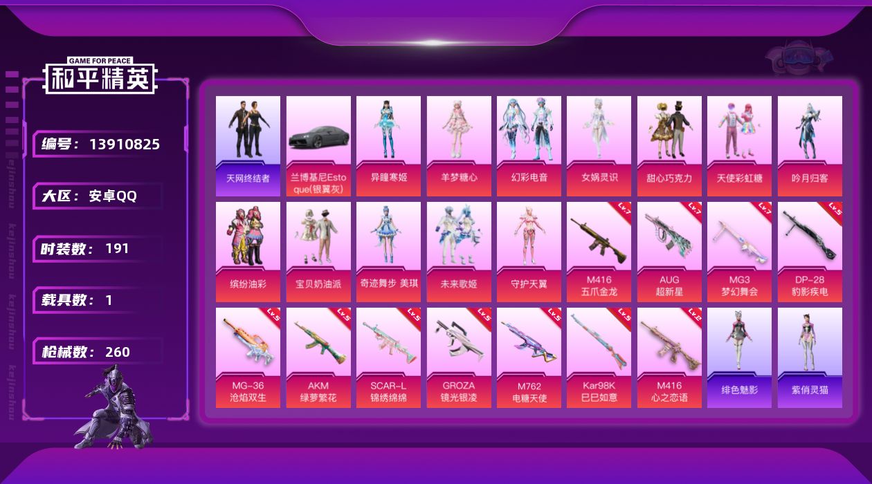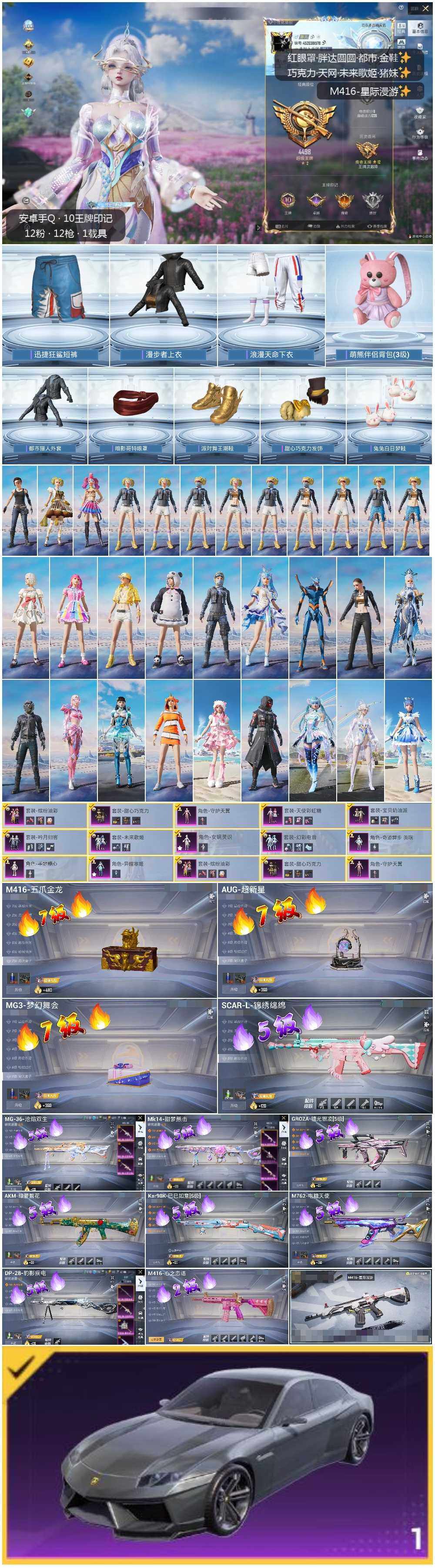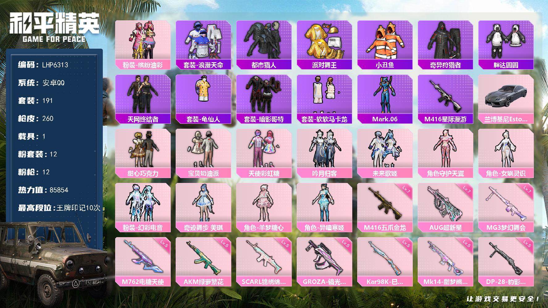 [13910825]【店主推荐捡漏号!可直接换绑】/素材身法号/地铁满天赋 安卓 手Q-12粉装-12特效枪-1载具-4粉色飞行器-8,5w热力值-10王牌印记-191套装-260枪皮【热门品类】:粉装-缤纷油彩,套装-浪漫天命,套装-都市猎人,套装-派对舞王,套装-小丑鱼,套装-奇异狩猎者,套装-胖达圆圆,套装-天网终结者,套装-龟仙人,套装-暗影哥特,套装-软软马卡龙,角色-Mark.06,M416-星际漫游【粉色载具】:兰博基尼Estoque(银翼灰)【粉色套装】:粉装-甜心巧克力,粉装-宝贝奶油派,粉装-天使彩虹糖,粉装-缤纷油彩,粉装-吟月归客,粉装-未来歌姬,角色-守护天翼,角色-女娲灵识,粉装-幻彩电音,角色-奇迹舞步 美琪,角色-羊梦糖心,角色-异瞳寒姬【粉色枪皮等级】:AKM-绿萝繁花(五级),SCAR-L-锦绣绵绵(五级),M416-五爪金龙(七级),M416-心之恋语(二级),GROZA-镜光银凌(五级),AUG-超新星(七级),M762-电糖天使(五级),Kar98K-巳巳如意(五级),Mk14-甜梦熊击(五级),DP-28-豹影疾电(五级),MG3-梦幻舞会(七级),MG-36-沧焰双生(五级)【粉色飞行器】:镜域双华-灵镜之阶,幻海精灵飞行器,戏水时光飞行器