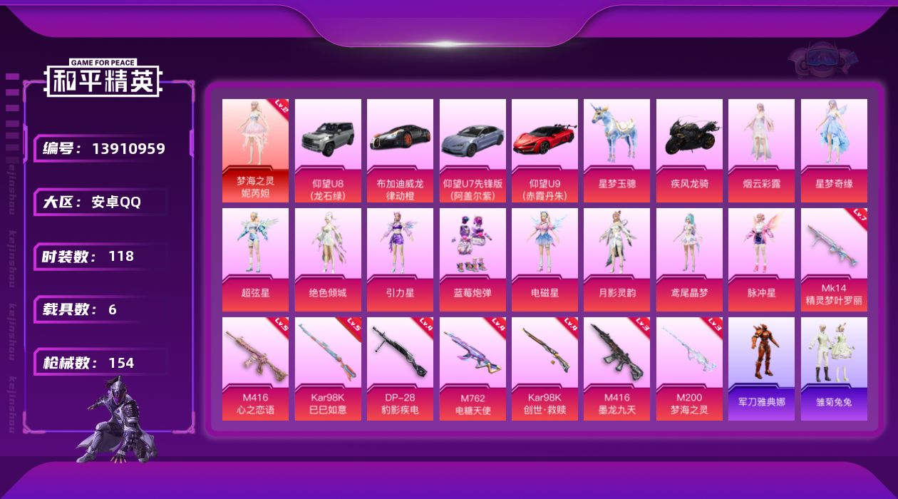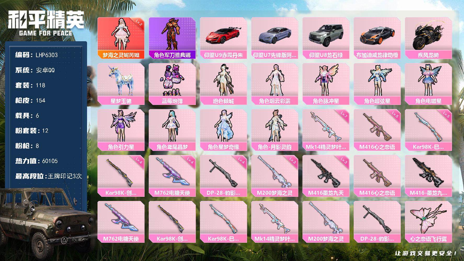 [13910959]【店主推荐捡漏号!可直接换绑】/素材身法号 安卓 手Q-1神装-12粉装-8特效枪-6载具-7粉色飞行器-6w热力值-3王牌印记-118套装-154枪皮【红色神装等级】:梦海之灵-妮芮妲(二级)【热门品类】:角色-军刀雅典娜【粉色载具】:仰望U9(赤霞丹朱),仰望U7(阿盖尔紫),仰望U8(龙石绿),布加迪威龙(律动橙),疾风龙骑,星梦玉骢【粉色套装】:粉装-蓝莓炮弹,角色-绝色倾城,角色-烟云彩露,角色-脉冲星,角色-超弦星,角色-电磁星,角色-引力星,角色-鸢尾晶梦,角色-星梦奇缘,角色-月影灵韵【粉色枪皮等级】:M416-心之恋语(五级),M416-墨龙九天(三级),M762-电糖天使(四级),Kar98K-创世·救赎(四级),Kar98K-巳巳如意(五级),Mk14-精灵梦叶罗丽(七级),M200-梦海之灵(三级),DP-28-豹影疾电(四级)【粉色飞行器】:心之恋语飞行翼,星夜魔法师飞行翼,纯梦嫁纱飞行翼,镜光幻境飞行翼,绝色倾城飞行器,龙翔九天飞行器,幻海精灵飞行器